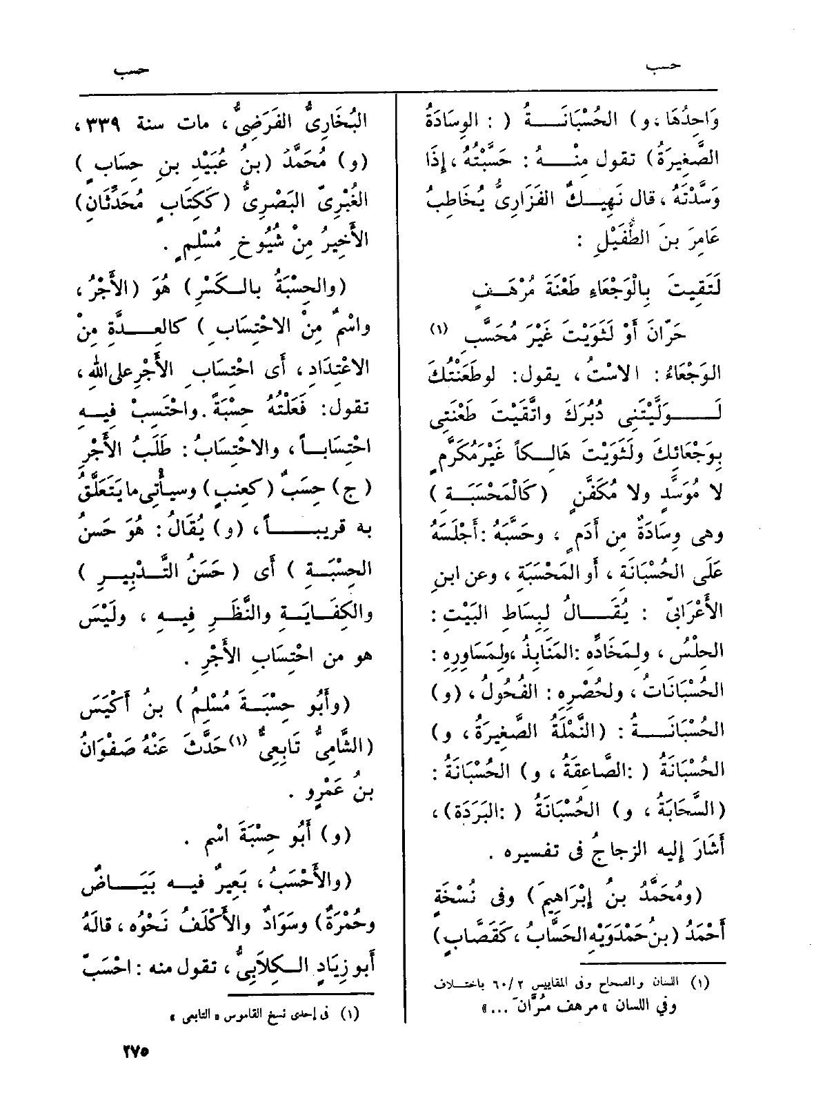 الوَجْعَاءُ: الاسْتُ، يَقُول: لَو طَعَنْتُكَ لَوَلَّيْتَنِي دُبُرَكَ واتَّقَيْتَ طَعْنَتِي بِوَجْعَائِكَ ولَثَوَيْتَ هَالِكاً غَيْرُ مُكَرَّمٍ لَا مُوَسَّدٍ وَلَا مُكَفَّنٍ (كَالْمَحْسَبَةِ) وَهِي وِسَادَةٌ وَلَا مُكَفَّنٍ (كَالْمَحْسَبَةِ) وَهِي وِسَادَةٌ مِن أَدَمٍ، وحَسَّبَهُ: أَجْلَسَهُ عَلَى الحُسْبَانَةِ، أَو المَحْسَبَةِ، وَعَن ابنِ الأَعْرَابيّ: يُقَالُ لِبِسَاطِ البَيْتِ: الحِلْسُ، ولِمخَادِّهِ: المَنَابِذُ، ولِمَسَاوِرِهِ: الحُسْبَانَاتُ، ولحُصْرِهِ: الفُحُولُ، (و) الحُسْبَانَةُ) (النَّمْلَةُ الصَّغِيرَةُ، و) الحُسْبَانَةُ (: الصَّاعِقَةُ، و) الحُسْبَانَةُ: (السَّحَابَةُ، و) الحُسْبَانَةُ (: البَرَدَة) ، أَشَارَ إِليه الزجاجُ فِي تَفْسِيره.