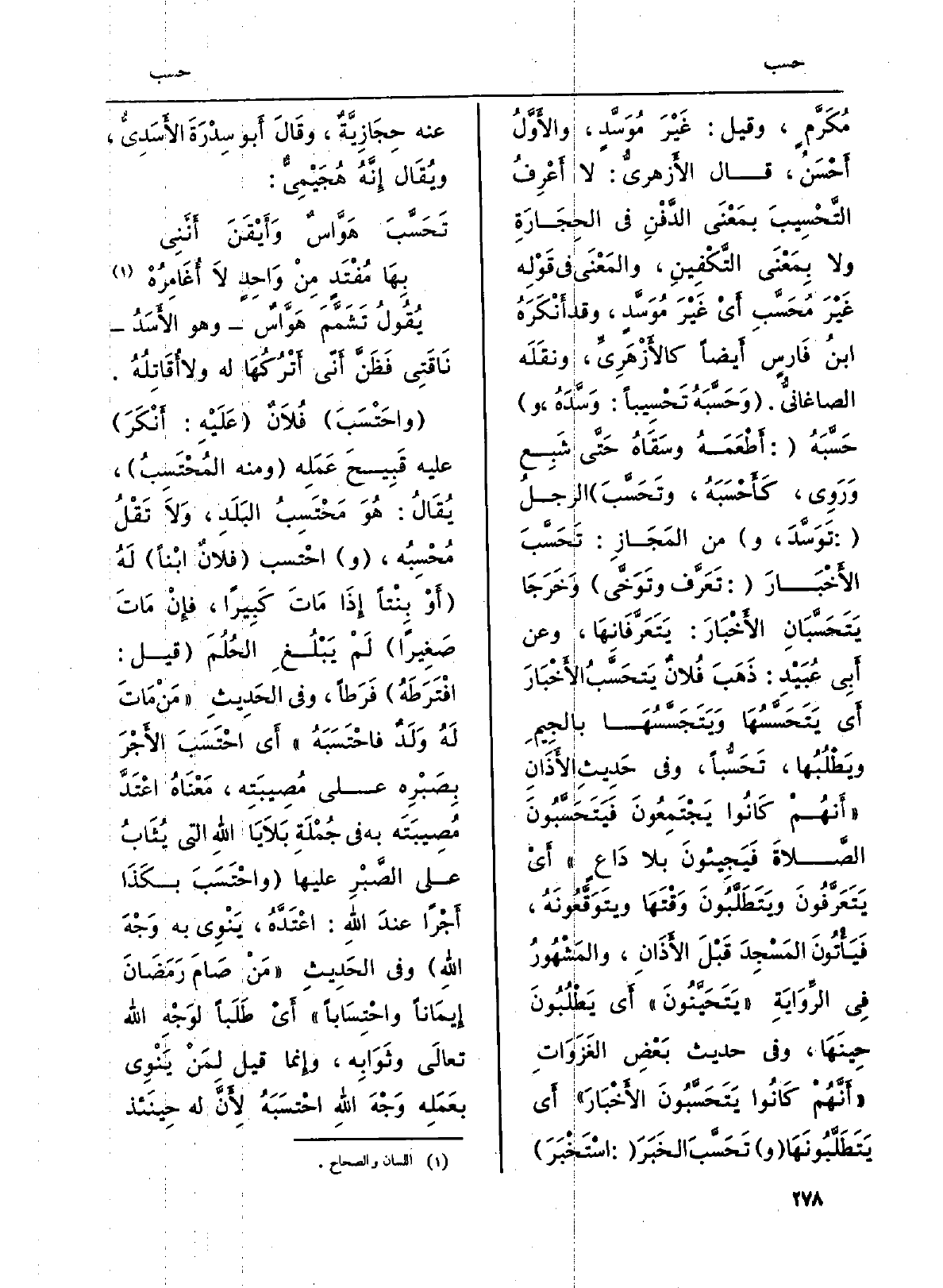 مُكَرَّمٍ، وَقيل: غَيْرَ مُوَسَّدٍ، والأَوَّلُ أَحْسَنُ، قَالَ الأَزهريُّ: لَا أَعْرِفُ التَّحْسِيبَ بمَعْنَى الدَّفْنِ فِي الحِجَارَةِ وَلَا بِمَعْنَى التَّكْفِينِ، والمَعْنَى فِي قَوْلِهِ غَيْرَ مُحَسَّبِ أَيْ غَيْرَ مُوَسَّدٍ، وَقد أَنْكَرَهُ ابنُ فَارسٍ أَيضاً كالأَزْهَرِيِّ، ونقَلَه الصاغانيُّ. (وَحَسَّبَهُ تَحْسِيباً: وَسَّدَهُ، و) حَسَّبَهُ (: أَطْعَمَهُ وَسَقَاهُ حَتَّى شَبِعَ وَرَوِي، كَأَحْسَبَهُ، وتَحَسَّبَ) الرجلُ (: تَوَسَّدَ و) من المَجَازِ: تَحَسَّبَ الأَخْبَارَ (: تَعَرَّف وتَوَخَّى) وَخَرَجَا يَتَحَسَّبَانِ الأَخْبَارَ: يَتَعَرَّفَانِهَا، وَعَن أَبِي عُبَيْدِ: ذَهَبَ فُلانٌ يَتحَسَّبُ الأَخْبَارَ أَي يَتَحَسَّسُهَا وَيَتجَسَّسُهَا بالجِيمِ يَطْلُبهَا، تَحَسُّباً، وَفِي حَدِيثِ الأَذَانِ (أَنهُمْ كَانُوا يَجْتَمِعُونَ فَيَتَحَسَّبُونَ الصَّلاةَ فَيَجِيئونَ بِلَا دَاعٍ) أَيْ يَتَعَرَّفُونَ وَيَتَطَلَّبُونَ وَقْتَهَا وَيتَوَقَّعُونَهُ، فَيَأْتُونَ المَسْجِدَ قَبْلَ الأَذَانِ، والمَشْهُورُ فِي الرِّوَايَةِ (يَتَحَيَّنُونَ) أَي يَطْلُبُونَ حِينَهَا، وَفِي حَدِيث بَعْضِ الغَزَوَاتِ (أَنَّهُمْ كَانُوا يَتَحَسَّبُونَ الأَخْبَارَ) أَي يَتَطَلَّبُونَهَا (و) تَحَسَّبَ الخَبَرَ (: اسْتَخْبَرَ) عَنهُ حِجَازِيَّةٌ، وقَالَ أَبو سِدْرَةَ الأَسَدِيُّ، ويُقَال إِنَّهُ هُجَيْمِيٌّ: