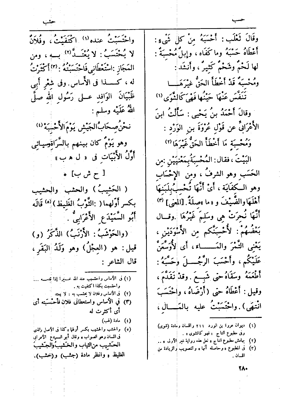 البَيْتَ، فَقَالَ: المُحْسِبَةُ بِمَعْنَيَيْنِ: مِن الحَسَبِ وَهُوَ الشرفُ، ومِن الإِحْسَابِ وَهُوَ الكِفَايَة، أَيْ أَنَّهَا تُحْسِبُ بِلَبَنِهَا أَهْلَهَا والضَّيْفَ و (مَا) صِلَةٌ. (الْمَعْنى) أَنَّها نُحِرَتْ هِي وسَلِمَ غَيْرُهَا. وَقَالَ بَعْضُهُمْ: لأُحْسِبَنَّكم مِن الأَسْوَدَيْنِ، يَعْنِي التَّمْرَ والمَاءَ، أَي لأُوَسِّعَنَّ عَلَيْكُمْ، وأَحْسَبَ الرَّجُلَ وحَسَّبَهُ: أَطْعَمَهُ وسَقَاهُ حَتَّى شَبِعَ. وقدْ تَقَدَّمَ، وَقيل: أَعْطَاهُ حَتَّى (أَرْضَاهُ، واحْتَسَبَ انْتَهَى) . واحْتَسَبْتُ عَلَيْهِ بالمَالِ، واحْتَسَبْتُ عِنْده اكْتَفَيْتُ، وفُلاَنٌ لَا يُحْتَسَبُ: لاَ يُعْتَدَّ بِهِ، وَمن المَجَازِ: اسْتَعْطَانِي فَاحْتَسَبْتُهُ: أَكْثَرْتُ لَهُ، كَذَا فِي الأَساس. وَفِي شِعْرِ أَبِي ظَبْيَانَ الوَافِدِ على رَسُولِ اللَّهِ صلى الله عَلَيْهِ وَسلم