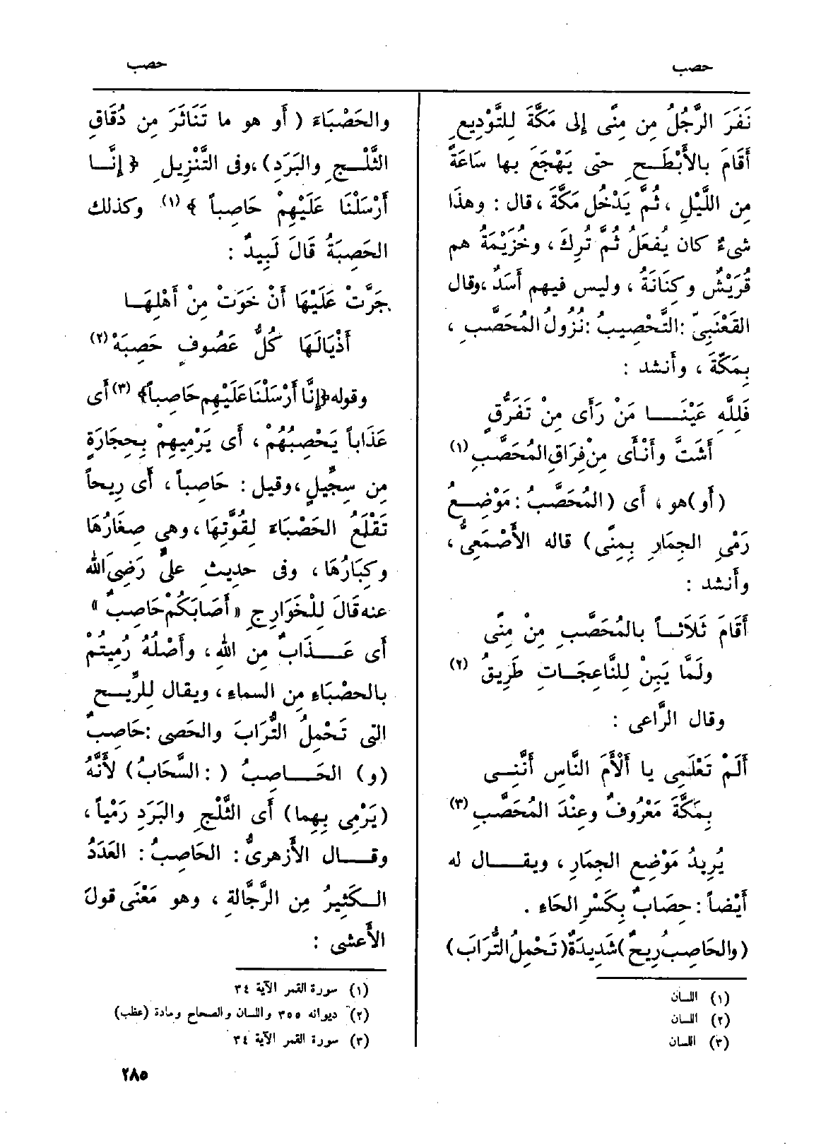 وَقَوله: {2. 020 انا اءَرسلنا عَلَيْهِم حاصبا} (الْقَمَر: 34) أَي عَذَاباً يَحْصِبُهُمْ، أَي يَرْمِيهِمْ بِحِجَارَةٍ مِنْ سِجِّيلٍ، وَقيل: حَاصِباً، أَي رِيحاً تَقْلَعُ الحَصْبَاءَ لِقُوَّتِهَا، وَهِي صِغَارُهَا وكِبَارُهَا، وَفِي حدِيثِ عليَ رَضِيَ الله عَنهُ قَالَ لِلْخَوَارِجِ (أَصَابَكُمْ حَاصِبٌ) أَي عَذَابٌ مِن اللَّهِ، وأَصْلُهُ رُمِيتُمْ بالحصْبَاءِ مِن السماءِ، وَيُقَال لِلرِّيح الَّتِي تَحْمِلُ التُّرَابَ والحَصى: حَاصِبٌ (و) الحَاصِبُ (: السَّحَابُ) لأَنَّهُ (يَرْمِي بِهِما) أَي الثَّلْجِ والبَرَدِ رَمْياً، وَقَالَ الأَزهريُّ: الحَاصِبُ: العدَدُ الكَثِيرُ مِن الرَّجَّالةِ، وَهُوَ مَعْنَى قولَ الأَعشى: