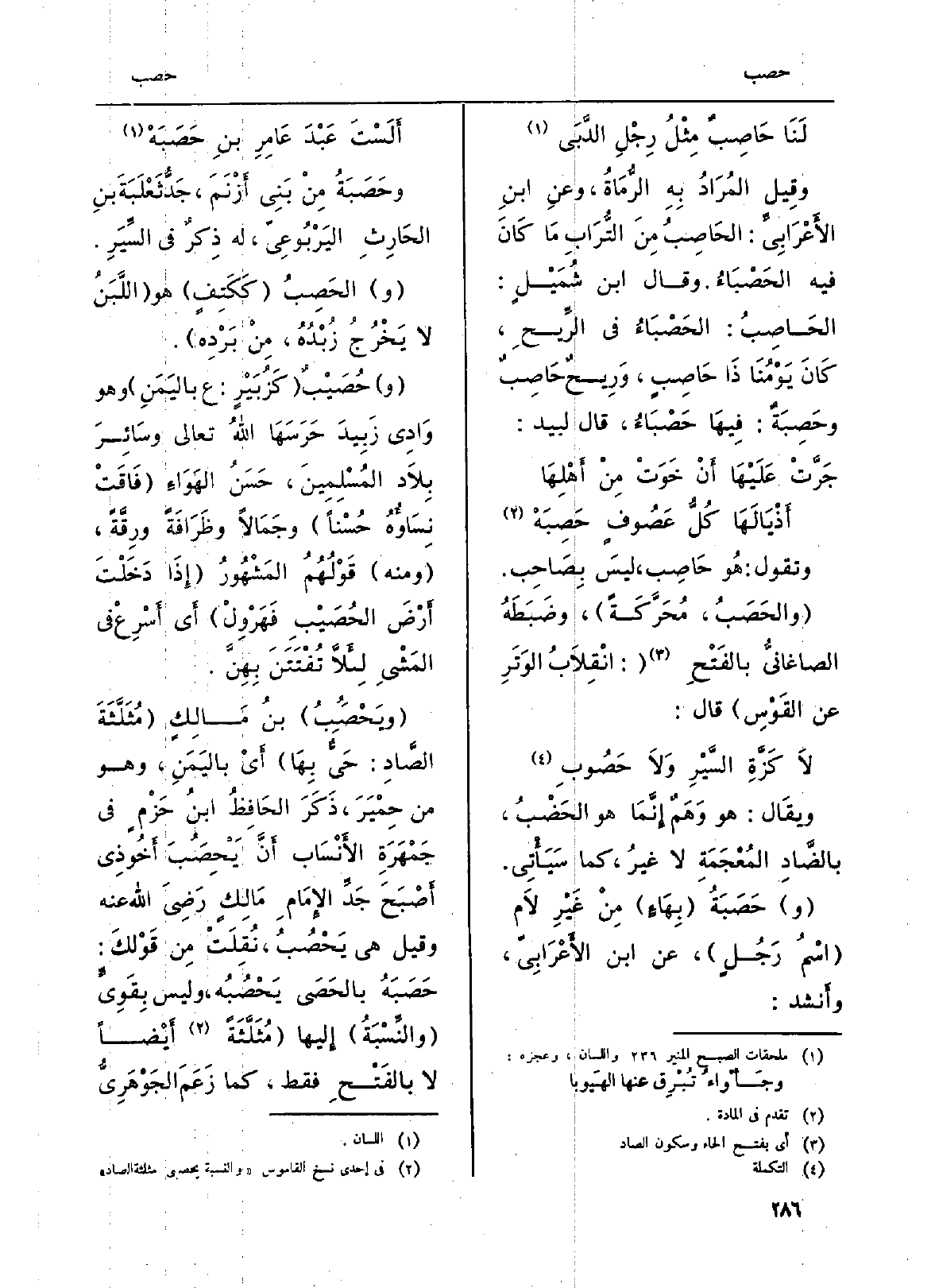 (و) حُصَيْبٌ (كَزُبَيْرٍ: ع باليَمَنِ) وَهُوَ وَادِي زَبِيدَ حَرَسَهَا اللَّهُ تَعَالَى وسَائِرَ بِلاَد المُسْلِمِينَ، حَسَنُ الهَوَاءِ (فَاقَتْ نِسَائْهُ حُسْناً) وجَمَالاً وظَرَافَةً ورِقَّةً، (وَمِنْه) قَوْلُهُمُ المَشْهُورُ (إِذَا دَخَلْتَ أَرْضَ الحُصَيْبِ فَهَرْوِلْ) أَي أَسْرِعْ فِي المَشْيِ لِئَلاَّ تُفْتَنَنَ بِهِنَّ.
