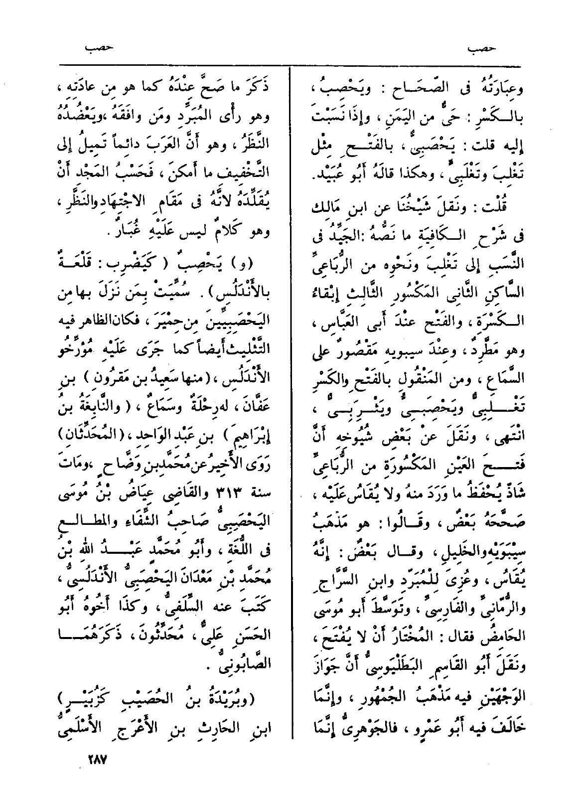 (و) يَحْصِبٌ (كَيَضْرِب: قَلْعَةٌ بالأَنْدَلُسِ) . سُمِّيَتْ بِمَن نَزَلَ بهَا مِن اليَحْصَبِيِّينَ مِن حِمْيَرَ، فَكَانَ الظَّاهِر فِيهِ التَّثْلِيث أَيضاً كَمَا جَرَى عَلَيْهِ مُؤرِّخُو الأَنْدَلُسِ، (مِنْهَا سَعِيدُ بن مَقُرُونِ) بنِ عَفَّانَ، لَهُ رِحْلَةٌ وَسَمَاعٌ، (والنَّابِغَةُ بنُ إِبْرَاهِيمَ) بنِ عَبْدِ الوَاحِدِ، (المُحَدِّثَانِ) رَوَى الأَخِيرُ عَن مُحَمَّدِ بنِ وَضَّاحٍ، ومَاتَ سنة 313 والقَاضِي عِيَاضُ بنْ مُوسَى اليَحْصَبِيُّ صَاحِبُ الشِّفَاءِ والمطالع فِي اللُّغَةِ، وأَبُو مُحَمَّدٍ عَبْدُ اللَّهِ بْنُ مُحَمَّدِ بْنِ مَعْدَانَ اليَحْصِبَيُّ الأَنْدَلُسِيُّ، كَتَبَ عَنهُ السِّلَفِيُّ، وكذَا أَخُوهُ أَبُو الحَسَنِ عَلِيٌّ، مُحَدِّثُون، ذَكَرَهُمَا الصَّابُونِيُّ.