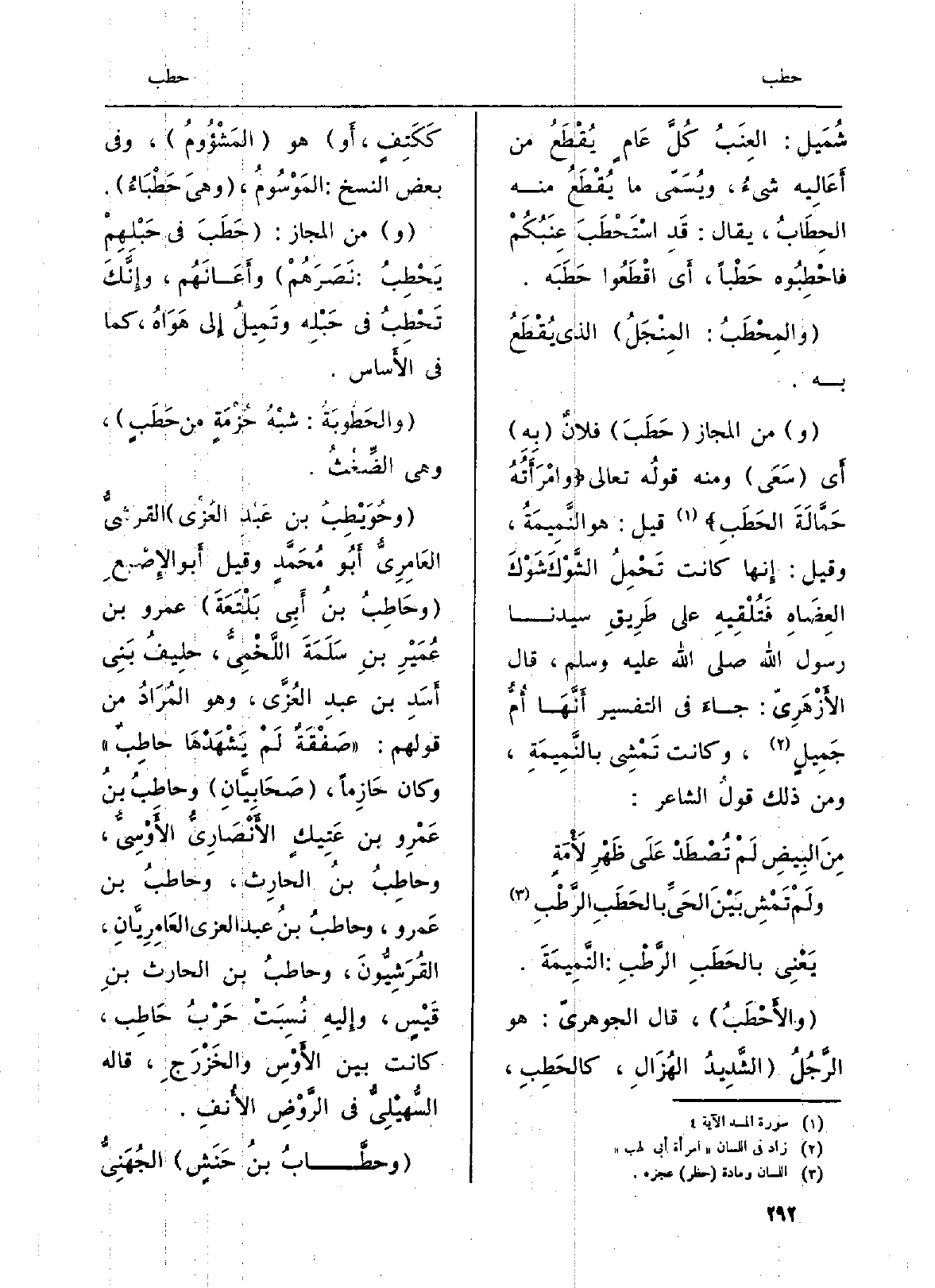 (و) من الْمجَاز (حَطَبَ) فلانٌ (بِهِ) أَي (سَعَى) وَمِنْه قولُه تَعَالَى: {2. 021 وامراءَته حمالَة الْحَطب} (المسد: 4) قيل: هُوَ النَّمِيمَةُ، وَقيل: إِنها كَانَت تَحْمِلُ الشَّوْكَ شَوْكَ العِضَاهِ فَتُلْقِيهِ على طَرِيقِ سيدنَا رَسُول الله صلى الله عَلَيْهِ وَسلم قَالَ الأَزْهَرِيّ: جاءَ فِي التَّفْسِير أَنَّهَا أُمّ جَمِيلٍ، وَكَانَت تَمْشِي بالنَّمِيمَةِ، وَمن ذَلِك قولُ الشَّاعِر: