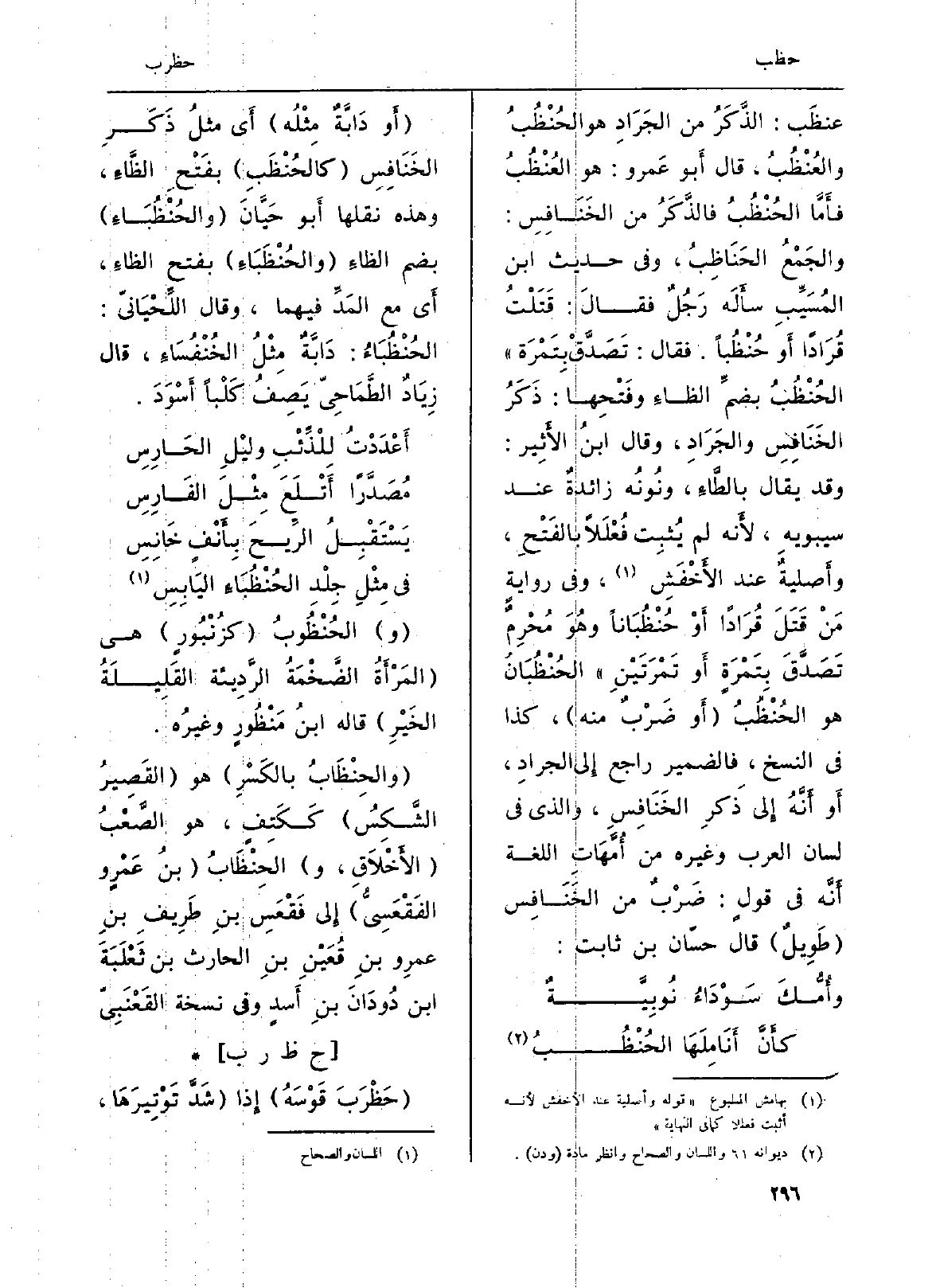 عنظَب: الذَّكَرُ من الجَرَادِ هُوَ الحُنْظُبُ والعُنْظُبُ، قَالَ أَبو عَمرو: هُوَ العُنْظُبُ فأَمَّا الحُنْظُبُ فالذكَرُ من الخَنَافِسِ: والجَمْعُ الحَنَاظِبُ، وَفِي حَدِيث ابْن المُسَيِّبِ سأَلَه رَجُلٌ فقالَ: قَتَلْتُ قُرَاداً أَو حُنْظُباً. فَقَالَ: تَصَدَّقْ بِتَمْرَة) الحُنْظُبُ بضمِّ الظاءِ وفَتْحِهَا: ذَكَرُ الخَنَافِسِ والجَرَادِ، وَقَالَ ابنُ الأَثِير: وَقد يُقَال بالطَّاءِ، ونُونُه زائدةٌ عِنْد سيبويهِ، لأَنه لم يُثبِت فُعْلَلاً بالفَتْحِ، وأَصليةٌ عِنْد الأَخْفَشِ، وَفِي روايةٍ مَنْ قَتَلَ قُرَاداً أَوْ حُنْظُبَاناً وهُوَ مُحْرِمٌ تَصَدَّقَ بِتَمْرَةٍ أَو تَمْرَتَيْنِ) الحُنْظُبَانُ هُوَ الحُنْظُبُ (أَو ضَرْبٌ مِنْهُ) ، كَذَا فِي (النّسخ) ، فَالضَّمِير رَاجع إِلى الجرادِ، أَو أَنَّهُ إِلى ذكرِ الخَنَافِسِ، وَالَّذِي فِي (لِسَان الْعَرَب) وَغَيره من أُمَّهَاتِ اللُّغَة أَنَّه فِي قولٍ: ضَرْبٌ من الخَنَافِس (طَوِيلٌ) قَالَ حسّان بن ثَابت: