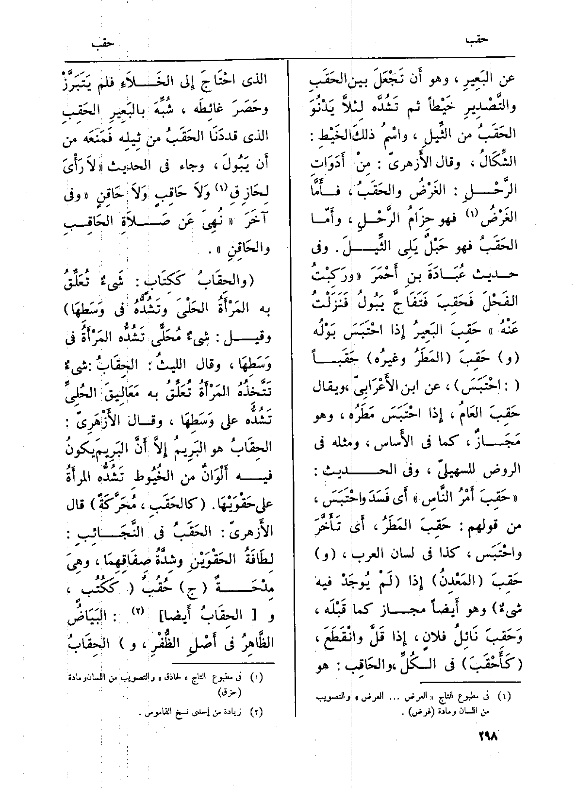 (والحِقَابُ كَكِتَابٍ: شَيْءٌ تُعَلِّقُ بِهِ المَرْأَةُ الحَلْيَ وتَشُدُّهُ فِي وَسَطِهَا) وَقيل: شيءٌ مُحَلًّى تَشُدُّهُ المَرْأَةُ فِي وَسَطِهَا، وَقَالَ الليثُ: الحِقَابُ: شَيْء تَتَّخِذُهُ المَرْأَةُ تُعَلِّقُ بِهِ مَعَالِيقَ الحُلِيِّ تَشُدُّهُ على وَسَطِهَا، وَقَالَ الأَزْهَرِيّ: الحِقَابُ هُوَ البَرِيمُ إِلاَّ أَنَّ البَرِيمَ يكونُ فِيهِ أَلْوَانٌ من الخُيُوطِ تَشُدُّه المرأَةُ على حَقْوَيْهَا. (كالحَقَبِ، مُحَرَّكَةً) قَالَ الأَزِريّ: الحَقَبُ فِي النَّجَائِبِ: لِطَافَةُ الحَقْوَيْنِ وشِدَّةُ صِفَاقِهِمَا، وهِيَ مِدْحَةٌ (ج) حُقُبٌ (كَكُتُبٍ، و (الحِقَابُ أَيضاً) : البَيَاضُ الظَّاهِرُ فِي أَصْلِ الظُّفْرِ، و) الحِقَابُ