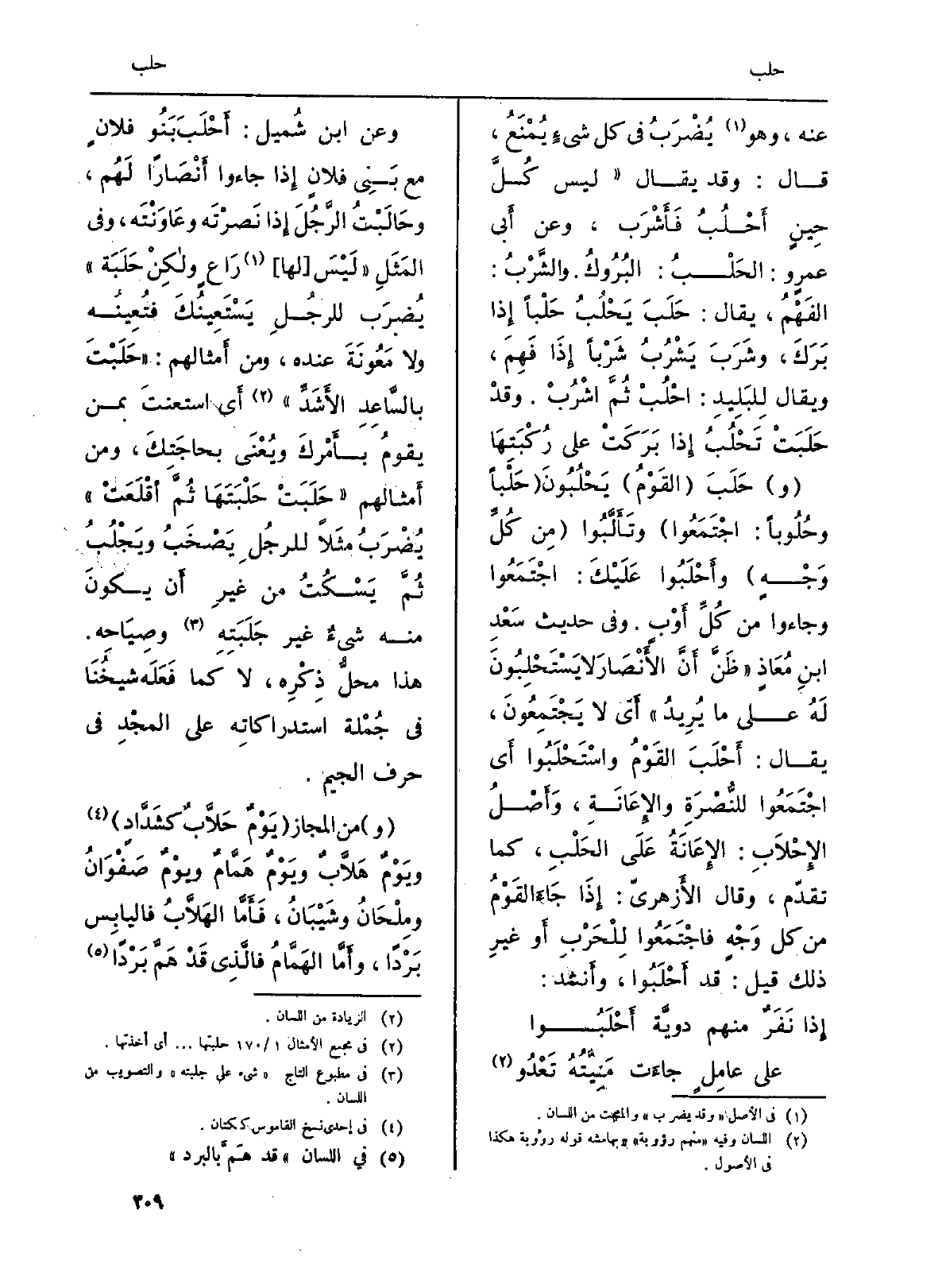 (و) حَلَبَ (القَوْمُ) يَحْلُبُونَ (حَلْباً وحُلُوباً: اجْتَمَعُوا) وتَأَلَّبُوا (مِن كُلِّ وَجْهٍ) وأَحْلَبُوا عَلَيْكَ: اجْتَمَعُوا وَجَاءُوا من كُلِّ أَوْبٍ. وَفِي حَدِيث سَعْدِ ابنِ مُعاذٍ (ظَنَّ أَنَّ الأَنْصَارَ لاَ يَسْتَحْلِبُونَ لَهُ على مَا يُرَيدُ) أَي لَا يَجْتَمِعُونَ، يُقَال: أَحْلَبَ القَوْمُ واسْتَحْلَبُوا أَي اجْتَمَعُوا للنُّصْرَةِ والإِعَانَةِ، وَأَصْلُ الإِحْلاَبِ: الإِعَانَةُ عَلَى الحَلْبِ، كَمَا تقدّم، وَقَالَ الأَزهريّ: إِذَا جَاءَ القَوْمُ من كل وَجْهٍ فاجْتَمَعُوا لِلْحَرْبِ أَو غيرِ ذَلِك قيل: قد أَحْلَبُوا، وأَنشد: