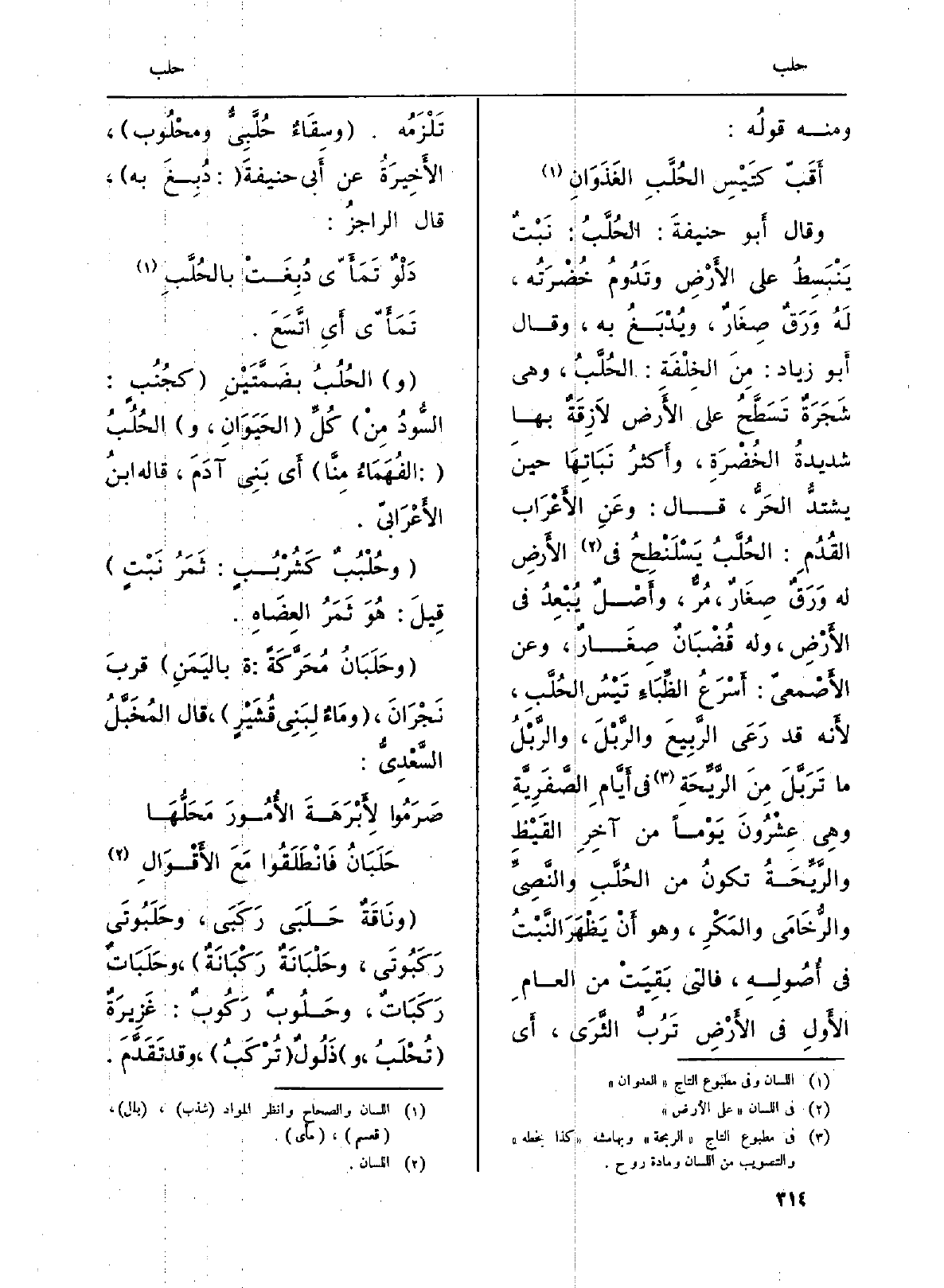 وَقَالَ أَبو حنيفَة: الحُلَّبُ: نَبْتٌ يَنْبَسِطُ على الأَرْضِ وتَدُومُ خُضْرَتُه، لَهُ وَرَقٌ صِغَارٌ، ويُدْبَغُ بِهِ، وَقَالَ أَبو زِيَاد: مِن الخِلْفَةِ: الحُلَّبُ، وَهِي شَجَرَةٌ تَسَطَّحُ على الأَرض لاَزِقَةٌ بهَا شديدةُ الخُضْرَةِ، وأَكثرُ نَبَاتِهَا حينَ يشتدُّ الحَرُّ، قَالَ: وعَنِ الأَعْرَاب القُدُمِ: الحُلَّبُ يَسْلَنْطِحُ فِي الأَرضِ لَهُ وَرَقٌ صِغَارٌ، مُرٌّ، وأَصْلٌ يُبْعِدُ فِي الأَرْضِ، وَله قُضْبَانٌ صِغَارٌ، وَعَن الأَصْمعيّ: أَسْرَعُ الظِّبَاءِ تَيْسُ الحُلَّبِ، لأَنه قد رَعَى الرَّبِيعَ والرَّبْلَ، والرَّبْلُ مَا تَرَبَّلَ مِنَ الرَّيِّحَةِ فِي أَيَّامِ الصَّفَرِيَّةِ وهِي عِشْرُونَ يَوْماً من آخِرِ القَيْظِ والرَّيِّحَةُ تكونُ من الحُلَّبِ والنَّصِيِّ والرُّخَامَى والمَكْرِ، وَهُوَ أَنْ يَظْهَرَ النَّبْتُ فِي أُصُولِهِ، فالتي بَقِيَتْ من العامِ الأَولِ فِي الأَرّضِ تَرُبُّ الثَّرَى، أَي تَلْزَمُه. (وسِقَاءٌ حُلَّبِيٌّ ومحْلُوب) ، الأَخِيرَةُ عَن أَبي حنيفةَ (: دُبِغَ بِهِ) ، قَالَ الراجزُ: