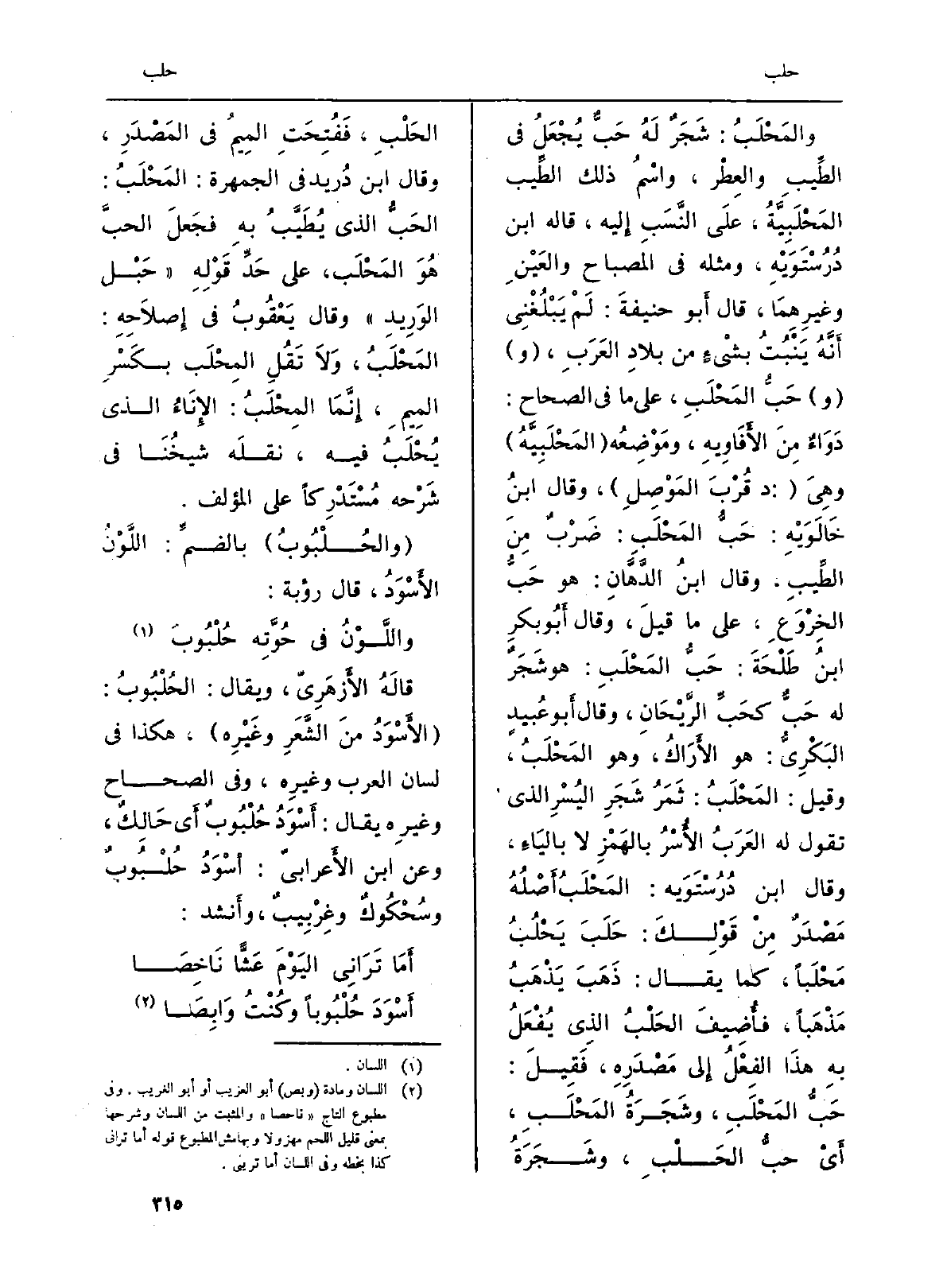 والمَحْلَبُ: شَجَآٌ لَهُ حَبٌّ يُجْعَلُ فِي الطِّيبِ والعِطْر، واسْمُ ذَلِك الطِّيب المَحْلَبِيَّةُ، علَى النَّسَبِ إِليه، قَالَه ابْن دُرُسْتَوَيْهِ، وَمثله فِي الْمِصْبَاح والعَيْنِ وغيرِهِمَا، قَالَ أَبو حنيفةَ: لَمْ يَبْلُغْنِي أَنَّهُ يَنْبُتُ بشيْءٍ من بلادِ العَرَبِ، (و) حَبُّ المَحْلَبِ، على مَا فِي (الصِّحَاح) : دَوَاءٌ مِنَ الأَفَاوِيهِ، ومَوْضِعُه (المَحْلَبِيَّهُ) وهِيَ (: د قُرْبَ المَوْصَلِ) ، وَقَالَ ابنُ خَالَوَيْهِ: حَبُّ المَحْلَبِ: ضَرْبٌ مِنَ الطِّيبِ، وَقَالَ ابنُ الدَّهَّانِ: هُوَ حَبُّ الخِرْوَعِ، على مَا قيلَ، وَقَالَ أَبُو بكرِ بنُ طَلْحَةَ: حَبُّ المَحْلَبِ: هُوَ شَجَرٌ لَهُ حَبٌّ كحَبِّ الرَّيْحَانِ، وَقَالَ أَبو عُبيدٍ البَكْرِيُّ: هُوَ الأَرَاكُ، وَهُوَ المَحْلَبخ، وَقيل: المَحْلَبُ: ثَمَرُ شَجَرِ اليُسْرِ الَّذِي تَقول لَهُ العَرَبُ الأُسْرُ بالهَمْزِ لَا باليَاءِ، وَقَالَ ابْن دُرُسْتَوَيه: المَحْلَبُ أَصْلُهُ مَصْدَرٌ مِنْ قَوْلِكَ: حَلَبَ يَحْلُبُ مَحْلَباً، كَمَا يُقَال: ذَهَبَ يَذْهَبُ مَذْهَباً، فأُضِيفَ الحَلْبُ الذِي يُفْعَلُ بهِ هذَا الفِعْلُ إِلى مَصْدَرِهِ، فَقِيلَ: حَبُّ المَحْلَبِ، وشَجَرَةُ المَحْلَبِ، أَي حبُّ الحَلْبِ، وشَجَرَةُ الحَلْبِ، فَفُتِحَتِ المِيمُ فِي المَصْدَرِ، وَقَالَ ابْن دُريد فِي (الجمهرة) : المَحْلَبُ: الحَبُّ الَّذِي يُطَيَّبُ بهِ فجَعلَ الحبَّ هُوَ المَحْلَب، على حَدِّ قَوْلِهِ (حَبل الوَرِيدِ) وَقَالَ يَعْقُوبُ فِي إِصلاَحِهِ: المَحْلَبُ، وَلاَ تَقُلِ المِحْلَب بكَسْرِ المِيمِ، إِنَّمَا المِحْلَبُ: الإِنَاءُ الَّذِي يُحْلَبُ فِيهِ، نقلَه شيخُنَا فِي شَرْحه مُسْتَدْرِكاً على الْمُؤلف.