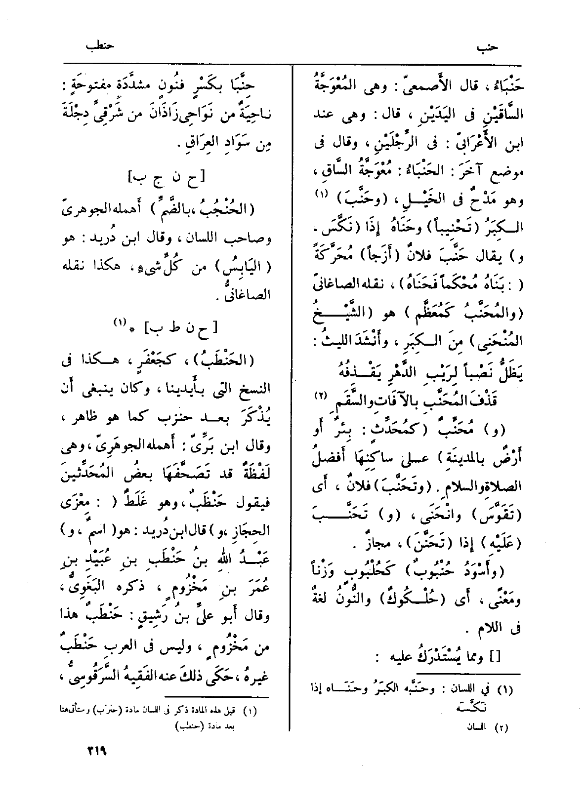 حُنْبَاءُ. قَالَ الأَصمعيّ: وَهِي المُعْوَجَّةُ السَّاقَيْنِ فِي اليَدَيْنِ، قَالَ: وَهِي عِنْد ابْن الأَعْرَابيّ: فِي الرِّجْلَيْنِ، وَقَالَ فِي مَوضِع آخَرَ: الحَنْبَاءُ: مُعْوَجَّةُ السَّاقِ، وَهُوَ مَدْحٌ فِي الخَيْلِ، (وحَنَّبَ) الكِبَرُ (تَحْنِيباً) وحَنَاهُ إِذَا (نَكَّسَ، و) يُقَال حَنَّبَ فلانٌ (أَزَجاً) مُحَرَّكَةً (: بَنَاهُ مُحْكَماً فَحَنَاهُ) ، نَقله الصاغانيّ (والمُحَنَّبُ كَمُعَظَّم) هُوَ (الشَّيْخُ المُنْحَنِي) مِنَ الكِبَرِ، وأَنْشَدَ الليثُ: