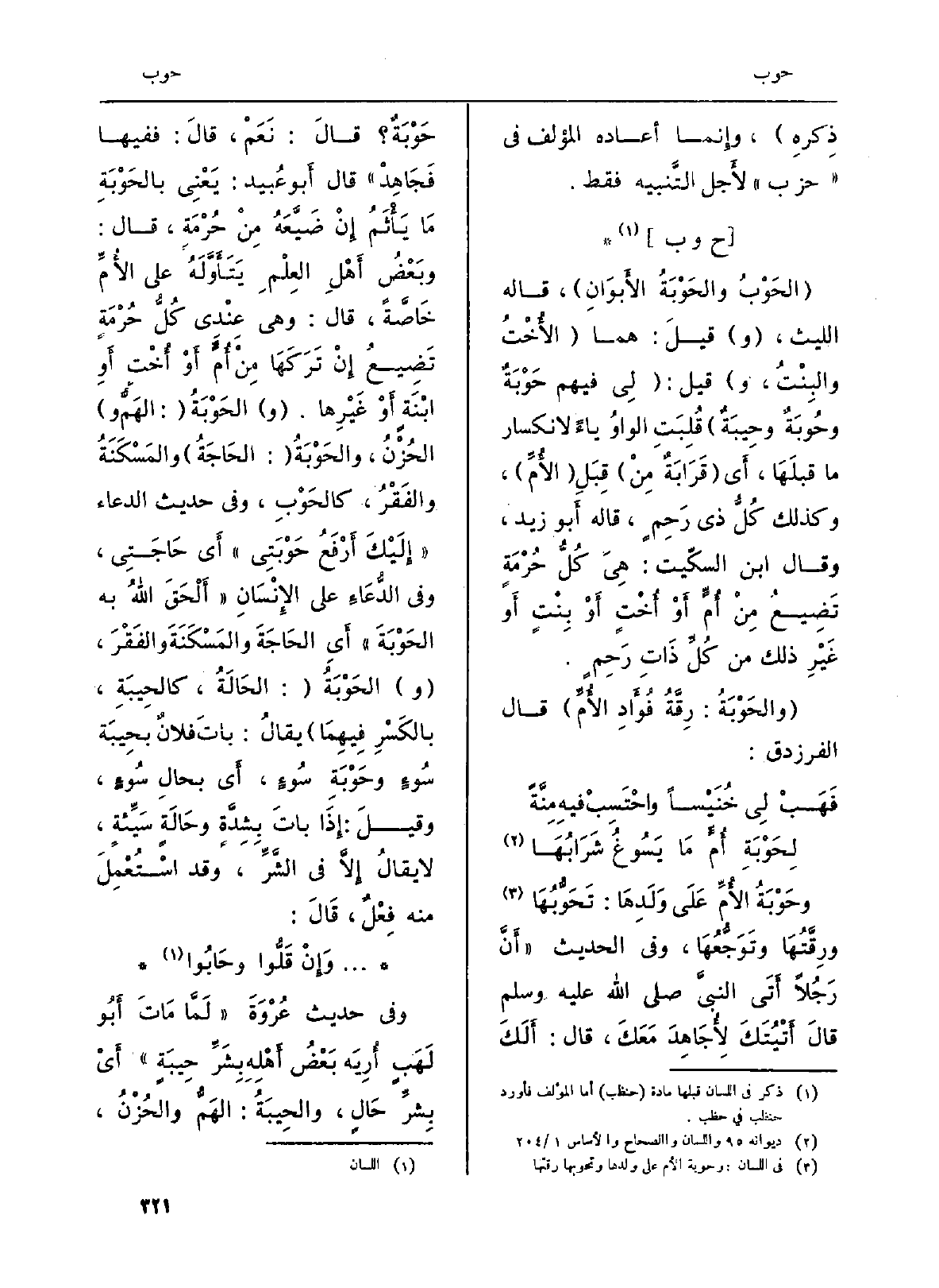 {وحَوْبَةُ الأُمِّ عَلَى وَلَدِهَا:} تَحَوُّبُهَا ورِقَّتُهَا وتَوَجُّعُهَا، وَفِي الحَدِيث (أَنَّ رَجُلاً أَتَى النبيَّ صلى الله عَلَيْهِ وسلمقالَ أَتَيْتُكَ لاِجَاهِدَ مَعَكَ، قَالَ: أَلَكَ حَوْبَةٌ؟ قالَ: نَعَمْ، قالَ: فَفِيهَا فَجَاهِدْ) قَالَ أَبو عُبَيْد: يَعْنِي بالحَوْبَةِ مَا يَأْثَمُ إِنْ ضَيَّعَهُ مِنْ حُرْمَةٍ، قَالَ: وبَعْضُ أَهْلِ العِلْمِ يَتَأَوَّلَهُ على الأُمِّ خَاصَّةً، قَالَ: وَهِي عِنْدِي كُلُّ حُرْمَةٍ تَضِيعُ إِنْ تَرَكَهَا مِنْ أُمَ أَوْ أُخْتٍ أَوِ ابنَةٍ أَوْ غَيْرِها. (و) الحَوْبَةُ (: الحَاجَةُ) والمَسْكَنَةُ والفَقْرُ، كالحَوْبِ، وَفِي حَدِيث الدُّعَاء (إِلَيْكَ أَرْفَعُ حَوْبَتِي) أَي حَاجَتِي، وَفِي الدُّعَاءِ على الإِنْسَانِ (أَلْحَقَ اللَّهُ بِهِ الحَوْبَةَ) أَيِ الحَاجَةَ والمَسْكَنَة والفَقْرَ، (و) الحَوْبَةُ (: الحَالَةُ، كالحِيبَةِ، بالكَسْرِ فِيهِمَا) يقالُ: باتَ فلانٌ {بحِيبَة سُوءٍ} وحَوْبَةِ سُوءٍ، أَي بحالِ سُوءٍ، وقيلَ: إِذَا باتَ بِشِدَّةٍ وحَالَةٍ سَيِّئةٍ، لَا يقالُ إِلاَّ فِي الشَّرِّ، وَقد اسْتُعْمِلَ مِنْهُ فِعْلٌ، قَالَ: