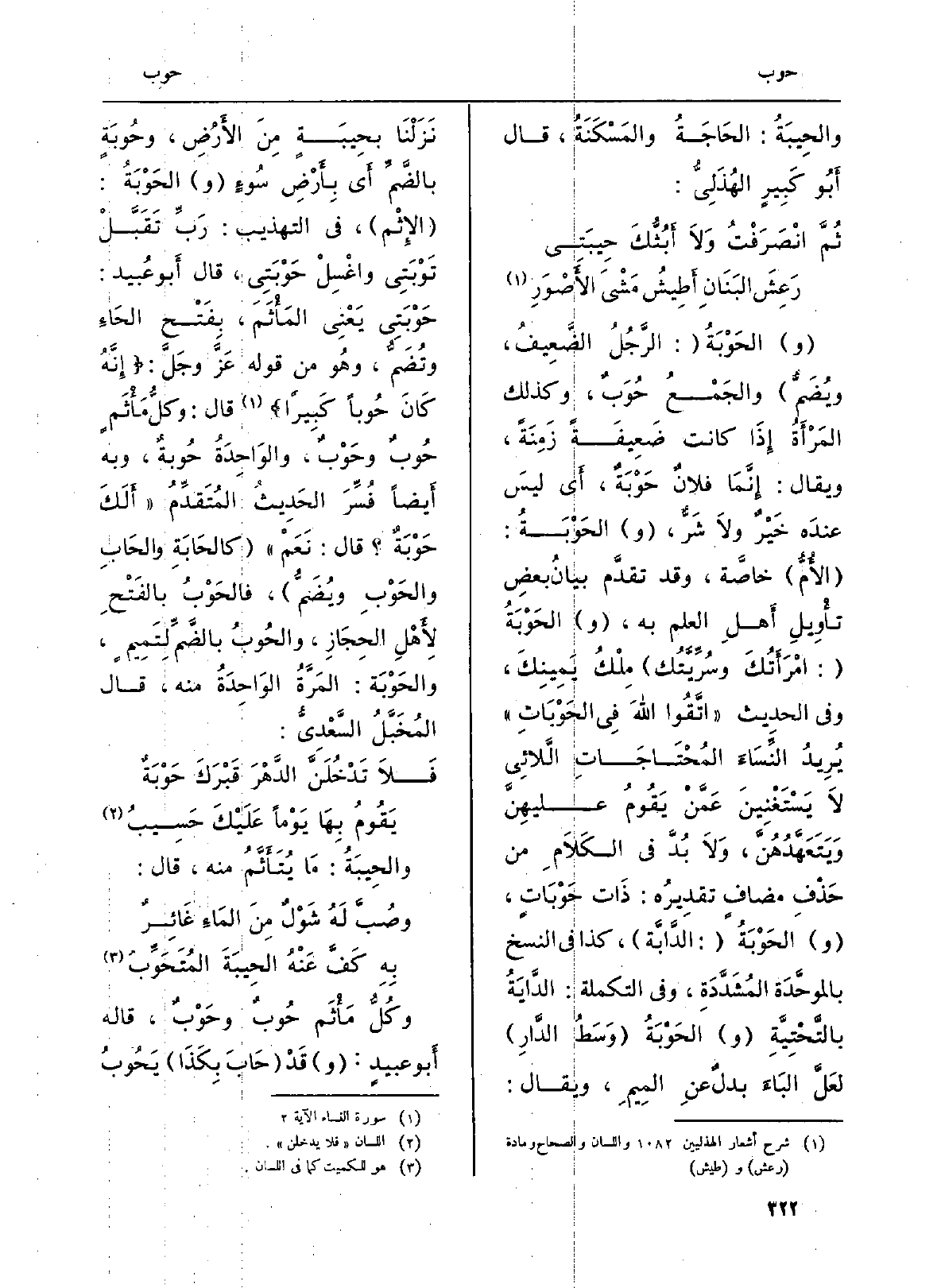 (و) الحَوْبَةُ (: الرَّجُلُ الضِّعِيفُ، ويُضَمُّ) والجَمْعُ} حُوَبٌ؛ وَكَذَلِكَ المَرْأَةُ إِذَا كَانَت ضَعِيفَةً زَمِنَةً، وَيُقَال: إِنَّمَا فلانٌ حَوْبَةٌ، أَي ليسَ عندَه خَيْرٌ ولاَ شَرٌّ، (و) الحَوحبَةُ: (الأُمُّ) : خاصَّة، وَقد تقدَّم بيانُ بعضِ تأْوِيلِ أَهلِ الْعلم بِهِ، (و) الحَوْبَةُ (: امْرَأَتُكَ وسُرِّيَّتُك) مِلْكُ يَمِينِكَ، وَفِي الحدِيث (اتَّقُوا اللَّهَ فِي {الحَوْبَاتِ) يُرِيدُ النِّسَاءَ المُحْتَاجَاتِ اللائِي لاَ يَسْتَغْنِينَ عَمَّنْ يَقُومُ عليهِنَّ وَيَتَعَهَّدُهُنَّ، وَلاَ بُدَّ فِي الكَلاَمِ من حَذْفِ مضافٍ تقدِيرُه: ذَات} حَوْبَاتٍ، و) الحَوْبَةُ (: الدَّابَّة) ، كَذَا فِي النّسخ بالموحَّدَة المُشَدَّدَةِ، وَفِي التكملة: الدَّايَةُ بالتَّحْتِيَّةِ (و) الحَوْبَةُ (وَسَطُ الدَّارِ) لعَلَّ البَاءَ بدلٌ عنِ المِيمِ، وَيُقَال: نَزَلْنَا بحِيبَةٍ مِنَ الأَرْضِ، وحُوبَةٍ بالضَّمِّ أَي بِأَرْضِ سُوءٍ (و) الحَوْبَةُ: (الإِثْم) ، فِي (التَّهْذِيب) : رَبِّ تَقَبَّلْ تَوْبَتِي واغْسِلْ {- حَوْبَتِي، قَالَ أَبو عُبيد: حَوْبَتِي يَعْنِي المَأْثَمَ، بِفَتْحِ الحَاءِ وتُضَمُّ، وَهُوَ من قَوْله عَزَّ وجَلَّ: {2. 023 انه كَانَ} حُوباً كَبِيرا} (النِّسَاء: 2) قَالَ: وكلُّ مَأْثَمٍ {حُوبٌ وحَوْبٌ، والوَاحِدَةُ حُوبةٌ، وَبِه أَيضاً فُسِّرَ الحَدِيثُ المُتَقدِّمُ (أَلَكَ حَوْبَةٌ؟ قَالَ: نَعَمْ) (كالحَابَةِ والحَابِ والحَوْبِ ويُضَمُّ) ، فالحَوْبُ بالفَتْحِ لاِءَهْلِ الحِجَازِ، والحُوبُ بالضَّمِّ لِتَمِيمٍ، والحَوْبَة: المَرَّةُ الوَاحِدَةُ مِنْهُ، قَالَ المُخَبَّلُ السَّعْدِيُّ: