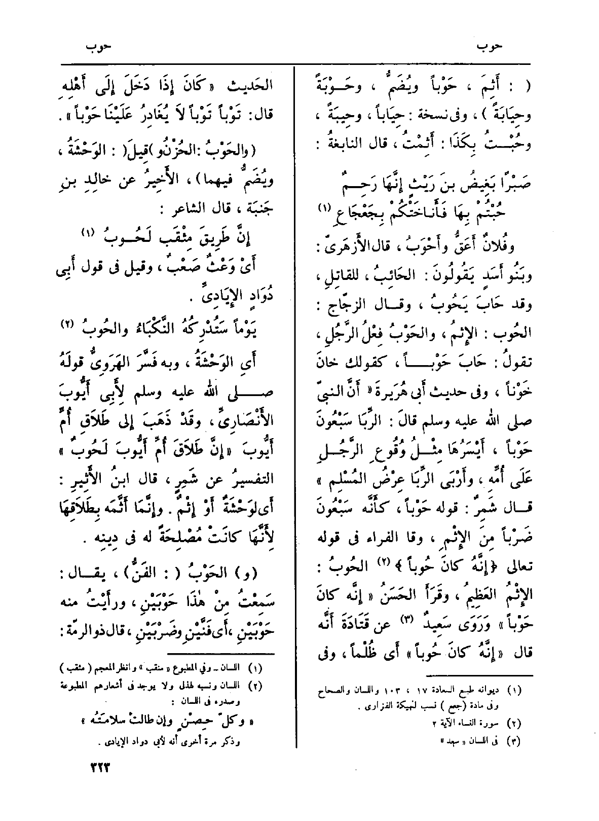 وفُلانٌ أَعَقُّ} وأَحْوَبُ، قَالَ الأَزهَريّ: وبَنُو أَسَدٍ يَقُولُونَ: {الحَائِبُ، للقاتِلِ، وَقد حَابَ يَحُوبُ، وَقَالَ الزجّاج: الحُوب: الإِثمُ، والحَوْبُ فِعْلُ الرَّجُلِ، تقولُ: حَابَ} حَوْباً، كَقَوْلِك خانَ خَوْناً، وَفِي حَدِيث أَبي هُرَيرةَ (أَنَّ النبيّ صلى الله عَلَيْهِ وَسلم قالَ: الرِّبَا سَبْعُونَ حَوْباً، أَيْسَرُهَا مِثْلُ وُقُوعِ الرَّجُلِ عَلَى أُمِّهِ، وأَرْبَى الرِّبَا عِرْضُ المُسْلِم) قَالَ شَمِرٌ: قَوْله حَوْباً، كأَنَّه سَبْعُونَ ضَرْباً مِنَ الإِثْمِ، وَقَالَ الْفراء فِي قَوْله تَعَالَى: {2. 023 انه كَانَ حوبا} (النِّسَاء: 2) الحُوبُ: الإِثْمُ العَظِيمُ، وقَرَأَ الحَسَنُ (إِنَّه كانَ {حَوْباً) وَرَوى سَعِيدٌ عَن قَتَادَةَ أَنَّه قَالَ: (إِنَّهُ كانَ حُوباً) أَي ظُلْماً، وَفِي الحَديث (كَانَ إِذَا دخَلَ إِلَى أَهْلِهِ قَالَ: تَوْباً تَوْباً لاَ يُغَادِرُ عَلَيْنَا حَوْباً) .