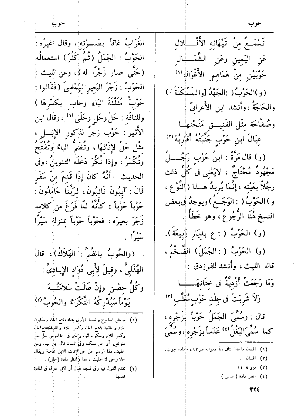 قَالَ: وسُمِّيَ الجَمَلُ حَوْباً بزَجْرِهِ، كَمَا سُمِّيَ البَغْلُ عَدَساً بزَجْرِهِ، وسُمِّيَ الغُرَابُ غاقاً بصَوْتِهِ، وَقَالَ غيرُه: الحَوْبُ: الجَمَلُ (ثُمَّ كَثُرَ) استعمالُه (حَتَّى صَار زَجْراً لَهُ) ، وَعَن اللَّيْث: الحَوْبُ: زَجْرُ البَعِيرِ لِيَمْضِيَ (فَقَالوا: حَوْبُ مُثَلّثَةَ البَاءِ وحابِ بكسْرِهَا) وللناقَةِ: حَلْ وحَلٍ وحَلَى، وَقَالَ ابْن الأَثير: حَوْب زجرٌ لذكورِ الإِبلِ، مِثْل حَلْ لإِنَاثِهَا، وتُضَمُّ الباءُ وتُفْتَحُ وتُكْسَرُ، وإِذا نُكِّرَ دَخَلَه التنوينُ، وَفِي الحَدِيث (أَنَّهُ كانَ إِذَا قَدِمَ مِنْ سَفَرٍ قَالَ: آيِبُونَ تَائِبُونَ، لِرَبَّنَا حَامِدُونَ: حَوْباً حَوْباً) كأَنَّهُ لمّا فَرَغَ من كلامِه زَجَرَ بعيرَه،} فحَوْباً حَوْباً بِمَنْزِلَة سَيْراً سَيْراً.
