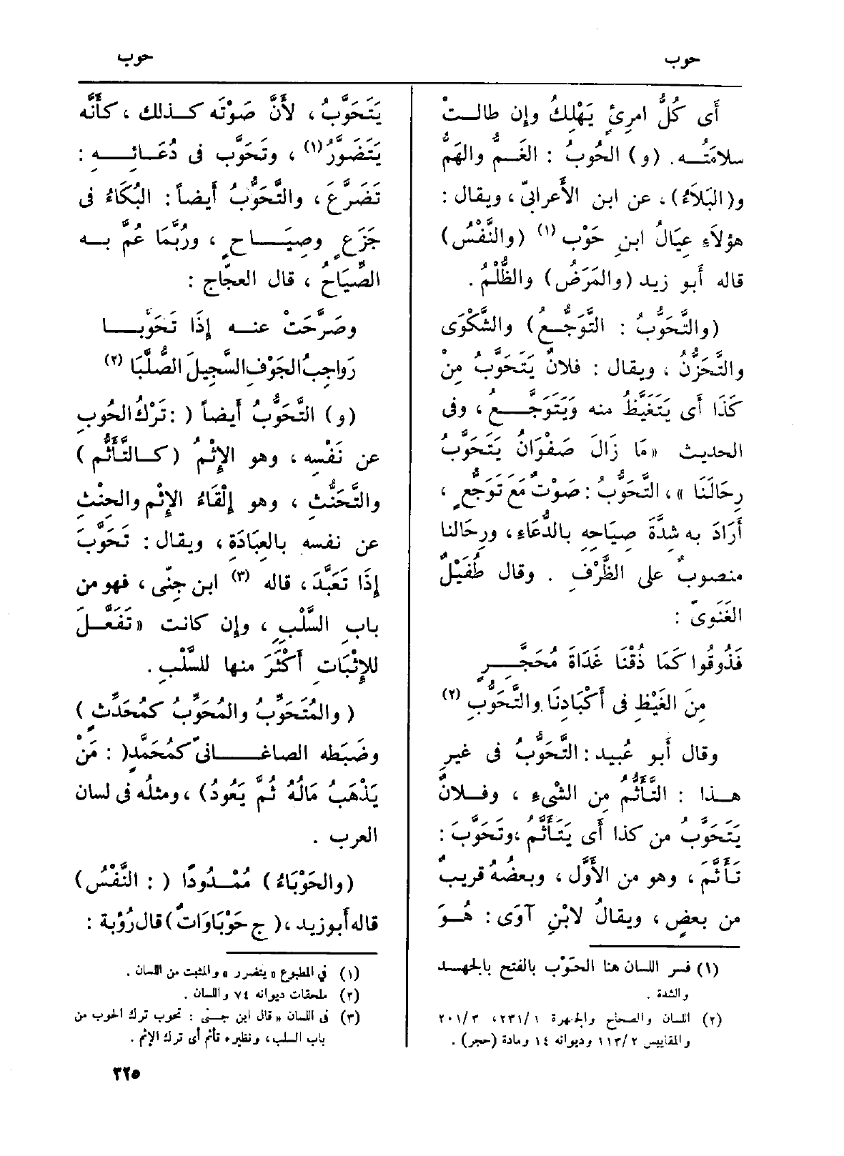 وَقَالَ أَبو عُبيد: {التَّحَوُّبُ فِي غيرِ هَذَا: التَّأَثُّمُ مِن الشيْءِ، وفلانٌ يَتَحَوَّبُ من كَذَا أَي يَتَأَثَّمُ،} وتَحَوَّبَ: تَأَثَّمَ، وَهُوَ من الأَوَّل، وبعضُهُ قريبٌ من بعضٍ، ويقالُ لابْنِ آوَى: هُوَ يَتَحَوَّبُ، لأَنَّ صَوْتَه كَذَلِك، كأَنَّه يَتَضَوَّرُ، وتَحَوَّب فِي دُعَائِهِ: تَضَرَّعَ، والتَّحَوُّبُ أَيضاً: البُكَاءُ فِي جَزَعٍ وصِيَاحٍ، ورُبَّمَا عُمَّ بِهِ الصِّيَاحُ، قَالَ العجّاج:
