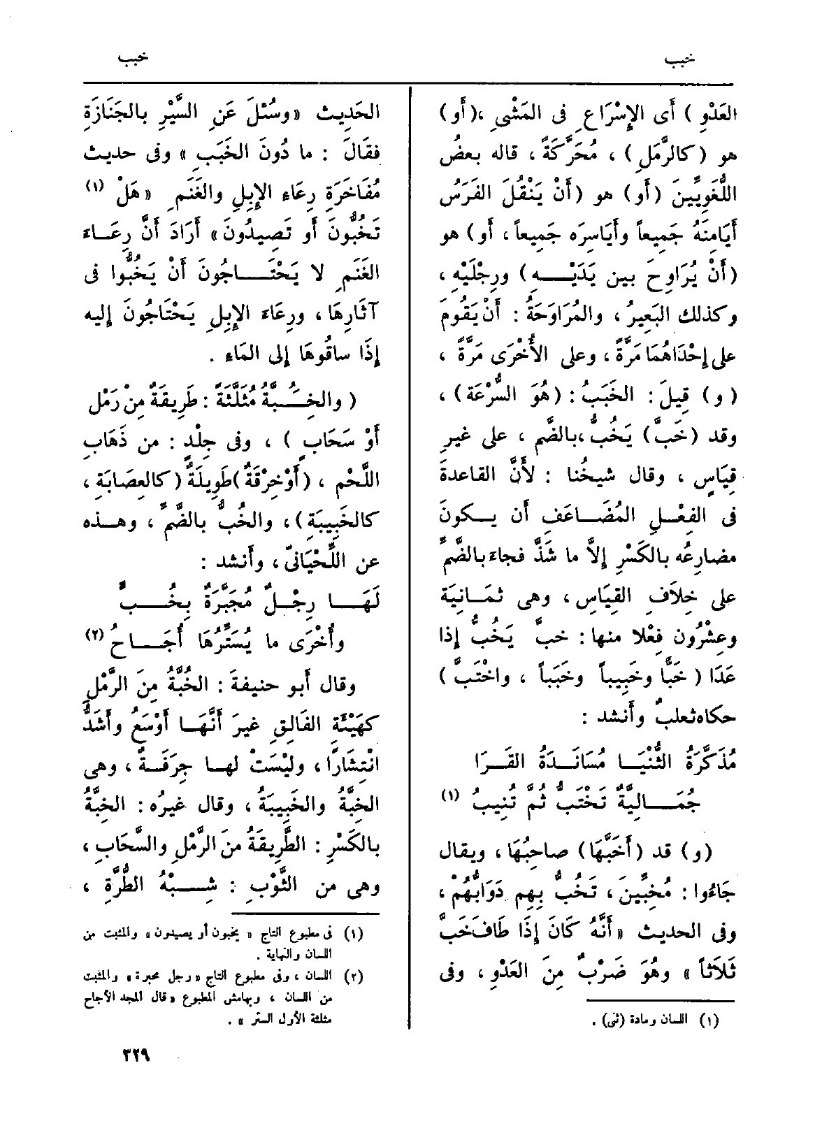 العَدْوِ) أَي الإِسْرَاعِ فِي المَشْيِ، (أَو) هُوَ (كالرَّمَلِ) ، مُحَرَّكَةً، قَالَه بعضُ اللُّغَوِيِّينَ (أَو) هُوَ (أَنْ يَنْقُلَ الفَرَسُ أَيَامِنَهُ جَمِيعاً وأَيَاسِرَه جَمِيعاً، أَو) هُوَ (أَنْ يُرَاوِحَ بَين يَدَيْهِ) ورِجْلَيْهِ، وَكَذَلِكَ البَعِيرُ، والمُرَاوَحَةُ: أَنْ يَقُومَ على إِحْدَاهُمَا مَرَّةً، وعَلى الأُخْرَى مَرَّةً (و) قِيلَ: {الخَبَبُ: (هُوَ السُّرْعَة) ، وَقد (خَبَّ) يَخُبُّ، بالضَّم، على غيرِ قِيَاسٍ، وَقَالَ شيخُنَا: لأَنَّ القاعدةَ فِي الفِعْلِ المُضَاعَفِ أَنْ يكونَ مضارِعُه بالكَسْرِ إِلاَّ مَا شَذَّ فجاءَ بالضَّمِّ على خِلاَفِ القِيَاسِ، وَهِي ثمَانِيَة وعِشْرُونَ فِعْلاً مِنْهَا: خبَّ يَخُبُّ إِذا عَدَا (} خَبًّا {وخَبِيباً} وخَبَباً، {واخْتَبَّ) حَكَاهُ ثعلبٌ وأَنشد: