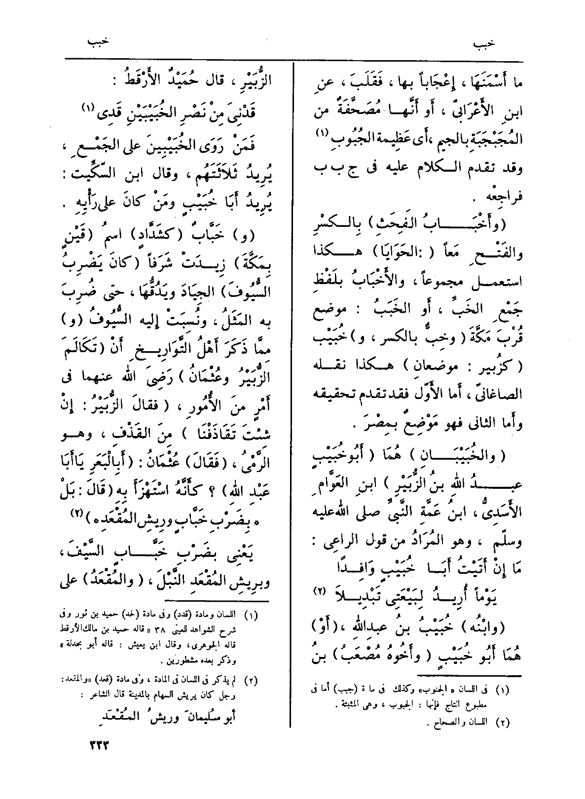 فَمَنْ رَوَى} الخُبَيْبِينَ على الجَمْعِ، يُرِيدُ ثَلاَثَتَهُمْ، وَقَالَ ابْن السّكِّيت: يُرِيدُ أَبَا خُبَيْبٍ ومَنْ كانَ على رَأْيِهِ.