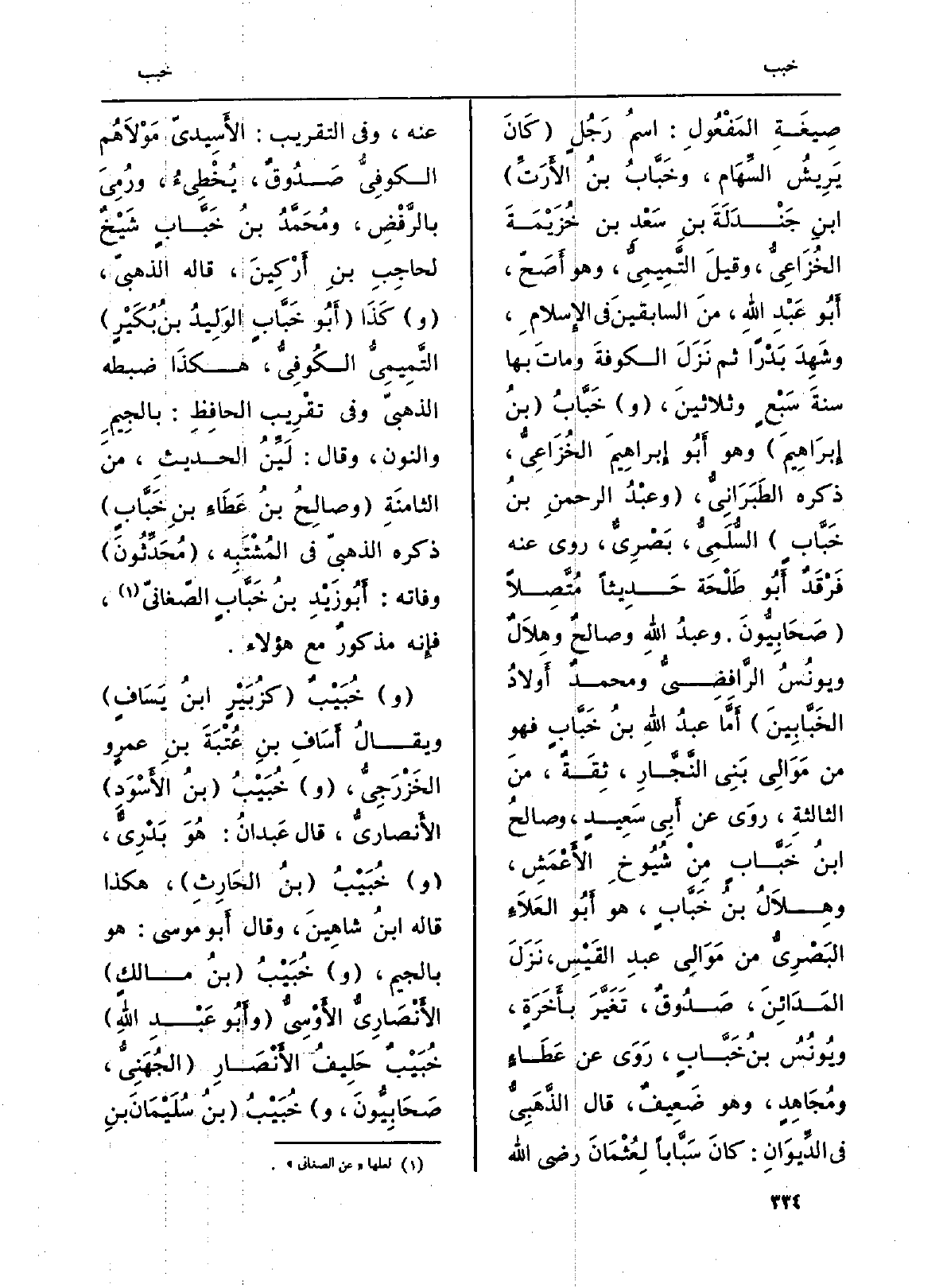 صِيغَةِ المَفْعُولِ: اسمُ رَجُلٍ (كَانَ يَرِيشُ السِّهَام، وخَبَّابُ بنُ الأَرَتِّ) ابنِ جَنْدَلَةَ بنِ سَعدِ بن خُزَيْمَةَ الخُزَاعِيُّ، وقيلَ التَّمِيمِيُّ، وَهُوَ أَصَحّ، أَبُو عَبْدِ اللَّهِ، منَ السابقينَ فِي الإِسلامِ، وشَهِدَ بَدْراً ثمَّ نَزَلَ الكوفةَ وماتَ بهَا سنةَ سَبْعٍ وثلاثينَ، (و) خَبَّابُ (بنُ إِبرَاهِيمَ) وَهُوَ أَبُو إِبراهِيمَ الخُزَاعِيُّ، ذكره الطَبَرَانِيُّ، (وعبْدُ الرحمنِ بنُ خَبَّابٍ) السُّلَمِيُّ، بَصْرِيٌّ، روى عَنهُ فَرْقَدٌ أَبُو طَلْحَة حَديثاً مُتَّصِلاً (صَحَابِيُّونَ. وعبدُ اللَّهِ وصالحٌ وهِلاَلٌ ويونُسُ الرَّافِضِيُّ ومحمدٌ أَولادُ! الخَبَّابِينَ) أَمَّا عبدُ اللَّهِ بنُ خَبَّابٍ فَهُوَ من مَوالِي بَنهي النَّجَّارِ، ثِقَةٌ، منَ الثالثةِ، روَى عَن أَبِي سَعِيدٍ، وصالحُ ابنُ خَبَّابٍ مِنْ شُيُوخِ الأَعمَشِ، وهِلاَلُ بنُ خَبَّابٍ، هُوَ أَبُو العَلاَءِ البَصْرِيُّ من مَوَالِي عبدِ القَيْسِ، نَزَلَ المَدَائِنَ، صَدُوقٌ، تَغَيَّرَ بأَخَرَةٍ، ويُونُسُ بنُ خَبَّابٍ، رَوَى عَن عَطاءٍ ومُجَاهِدٍ، وَهُوَ ضَعِيفٌ، قَالَ الذَّهَبِيُّ فِي الدِّيوَانِ: كانَ سَبَّاباً لِعُثْمَانَ رَضِيَ الله عَنهُ، وَفِي (التَّقْرِيب) : الأَسِيديّ مَوْلاَهُم الكوفِيُّ صَدُوقٌ، يُخْطِىءُ، ورُمِيَ بالرَّفْضِ، ومُحَمَّدُ بنُ خَبَّابٍ شَيْخٌ لحاجِبِ بنِ أَرْكِينَ، قَالَه الذهبيّ، (و) كَذَا (أَبُو خَبَّابٍ الوَالِيدُ بنُ بُكَيْرٍ) التَّمِيمِيُّ الكُوفِيُّ، هكذَا ضَبطه الذهبيُّ وَفِي (تقْرِيب الحافِظِ) : بالجِيمِ وَالنُّون، وَقَالَ: لَيِّنُ الحديثِ، منَ الثامنَةِ (وصالِحُ بنُ عَطَاءٍ بنِ حَبَّابٍ) ذكره الذهبيّ فِي المُشْتَبِه، (مُحَدِّثُونَ) وَفَاته: أَبُو زَيْد بنُ خَبَّابٍ الصّغانيّد فإِنه مذكورٌ مَعَ هَؤُلَاءِ.