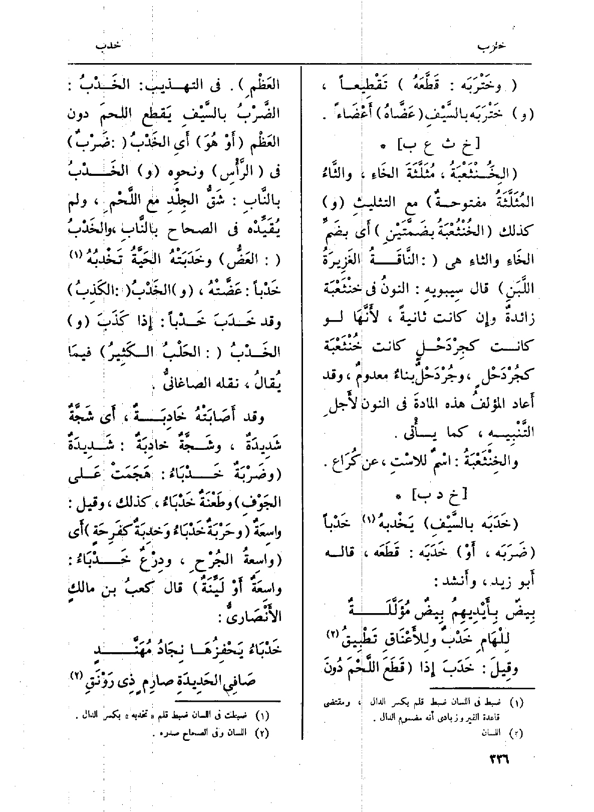 : (الخِ نْثَعْبَةُ، مُثَلَّثَةَ الخَاءِ، والثَّاءُ المُثَلَّثَةُ مفتوحةٌ) مَعَ التثليثِ (و) كَذَلِك (الخُنْثُعْبَةُ بضَمَّتَيْنِ) أَي بضَمِّ الخَاءِ والثاءِ هِيَ (: النَّاقَةُ الغَزِيرَةُ اللَّبَنِ) قَالَ سِيبَوَيْهٍ: النونُ فِي خنْثَعْبَة زائدةٌ وإِن كَانَت ثَانِيَة، لأَنَّهَا لَو كَانَت كجِرْدَحْلٍ كَانَت خُنْثَعْبَة كجُرْدَحْلٍ، وجْرْدَحْلٌ بناءٌ معدومٌ، وَقد أَعاد المؤلفُ هَذِه المادةَ فِي النُّون لأَجلِ التَّنْبِيهِ، كَمَا يأْتي.