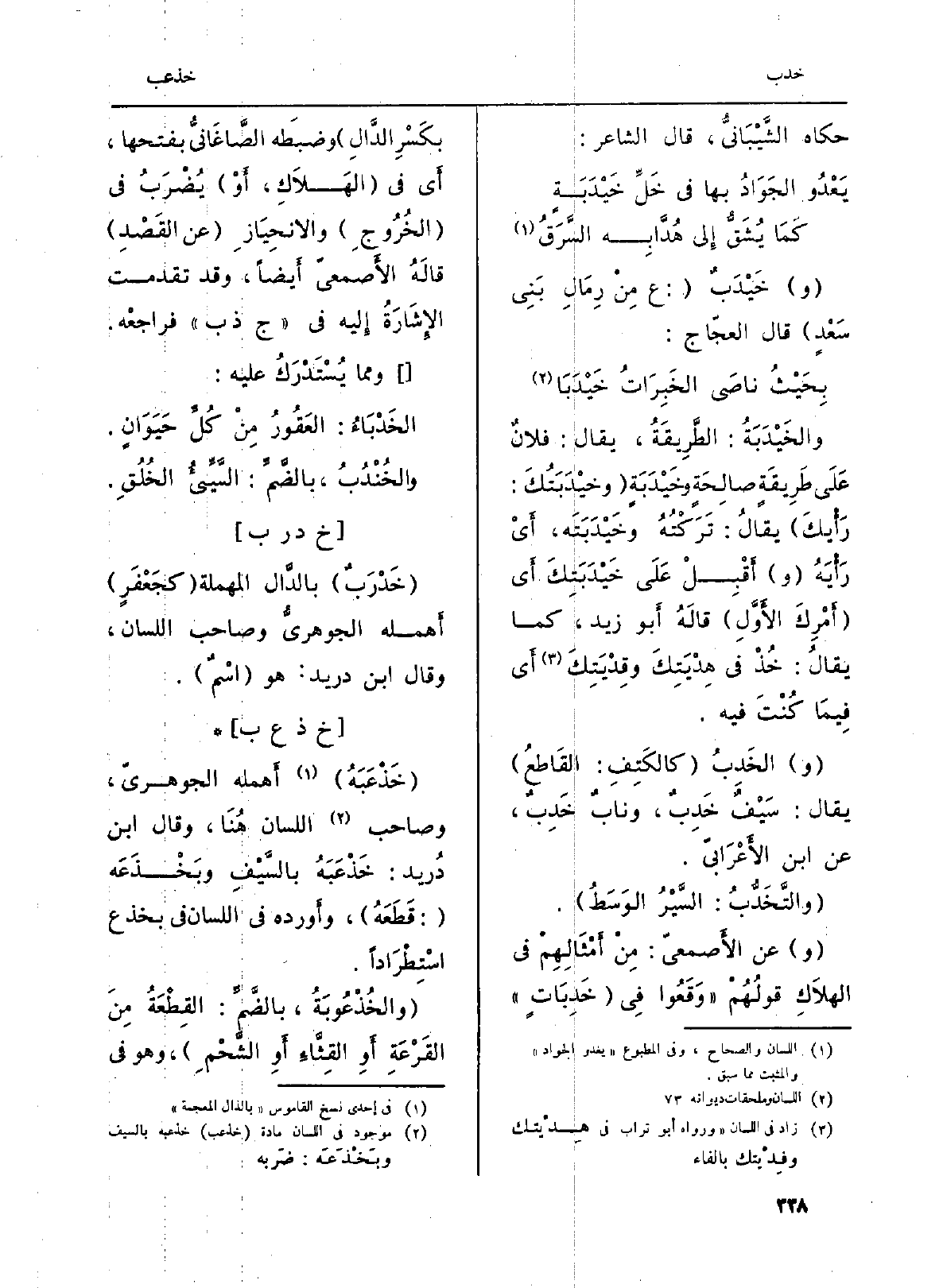 : (خَذْعَبَهُ) أَهمله الجوهريّ، وَصَاحب اللِّسَان هُنَا، وَقَالَ ابْن دُريد: خَذْعَبَهُ بالسَّيْفِ وبَخْذَعَه (: قَطَعَهُ) ، وأَورده فِي اللِّسَان فِي بخذع اسْتِطْرَاداً.