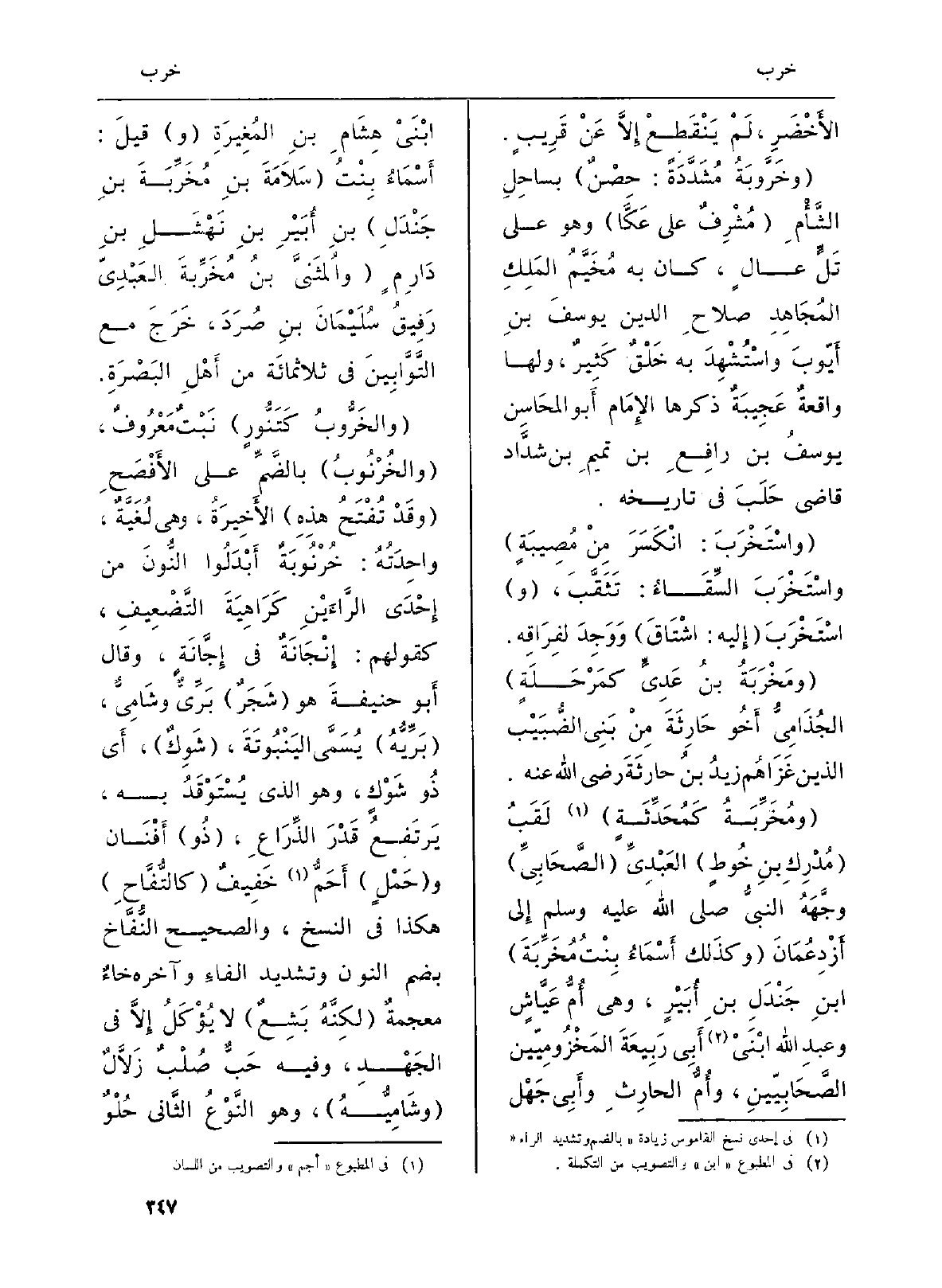 (ومُخَرِّبَةُ كَمُحَدِّقَةٍ) لَقَبُ (مُدْرِكِ بنِ خُوطٍ) العَبْدِيِّ (الصَّحَابِيِّ) وجَّهَهُ النبيُّ صلى الله عَلَيْهِ وسلمإِلى أَزْدِعُمَانَ (وكذَلك أَسْمَاءُ بِنْتُ مُخَرِّبَةَ) ابنِ جَنْدَلِ بنِ أُبَيْرٍ، وَهِي أُمُّ عَيَّاشٍ وعبدِ الله ابْنَيْ أَبِي رَبِيعَةَ المَخْزُومِيّين الصَّحَابِيّينِ، وأُمُّ الحارِثِ وأَبِي جَهْل ابْنَيْ هِشَامِ بنِ المُغِيرَةِ (و) قيلَ: أَسْمَاءُ بِنْتُ (سَلاَمَةَ بنِ مُخَرِّبَةَ بنِ جَنْدَلِ) بنِ أُبَيْرِ بنِ نَهْشَلِ بنِ دَارِمٍ (والمُثَنَّى بن مُخَرِّبةَ العَبْدِيّ رَفِيقُ سُلَيْمَانَ بنِ صُرَدَ، خَرَجَ مَعَ التَّوَّابِينَ فِي ثلاثماَة من أَهْلِ البَصْرَةِ.