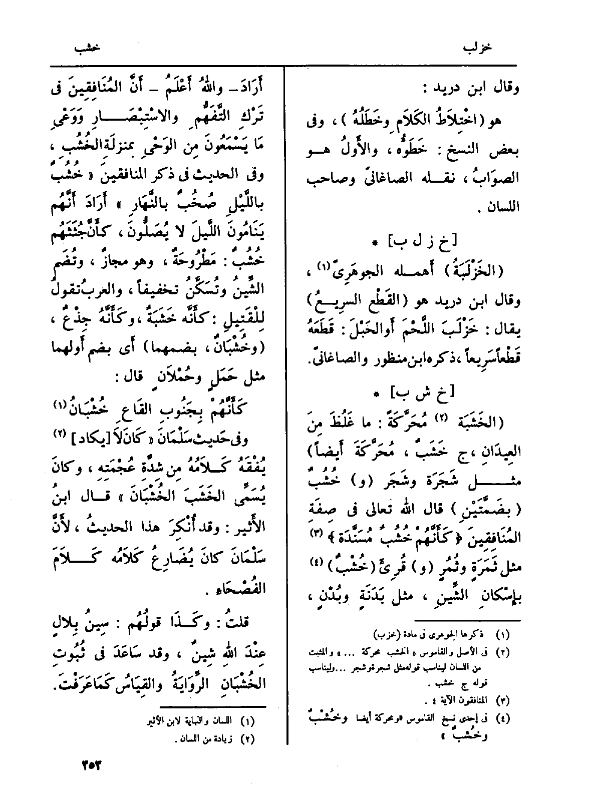 : (الخَشَبَة مُحَرَّكَةً: مَا غَلُظَ مِنَ العِيدَانِ، ج خَشَبٌ، مُحَرَّكَةَ أَيضاً) مثل شَجَرة وشَجَر (و) خُشُبٌ (بضَمَّتَيْنِ) قَالَ الله تَعَالَى فِي صفة المُنَافِقِينَ {2. 025 كاءَنهم خشب مُسندَة} (المُنَافِقُونَ: 4) مثل ثَمَرَةٍ وثُمُرٍ (و) قُرِىءَ (خُشْبٌ) بإِسْكَانِ الشِّينِ، مثل بَدَنَةٍ وبُدْنٍ، أَرَادَ واللَّهُ أَعْلَمُ أَنَّ المُنَافِقِينَ فِي تَرْكِ التَّفَهُّمِ والاسْتِبْصَارِ وَوَعْيِ مَا يَسْمَعُونَ مِن الوَحْيِ بمنزلَةِ الخُشُبِ، وَفِي الحَدِيث فِي ذكر المنافقينَ (خُشُبٌ باللَّيْلِ صُخُبٌ بالنَّهَارِ) أَرَادَ أَنَّهُمْ يَنَامُونَ اللَّيلَ لَا يُصَلُّونَ، كأَنَّ جُثَثَهُم خُشُبٌ: مَطْرُوحَةٌ، وَهُوَ مجازٌ، وتُضَم الشِّينُ وتُسَكَّنُ تَخْفِيفًا، والعربُ تقولُ لِلْقَتِيلِ: كأَنَّه خَشَبَةٌ، وكَأَنَّهُ جِذْعٌ، (وخُشْبَانٌ، بضمهما) أَي بِضَم أَولهما مثل حَمَلٍ وحُمْلاَنٍ قَالَ: