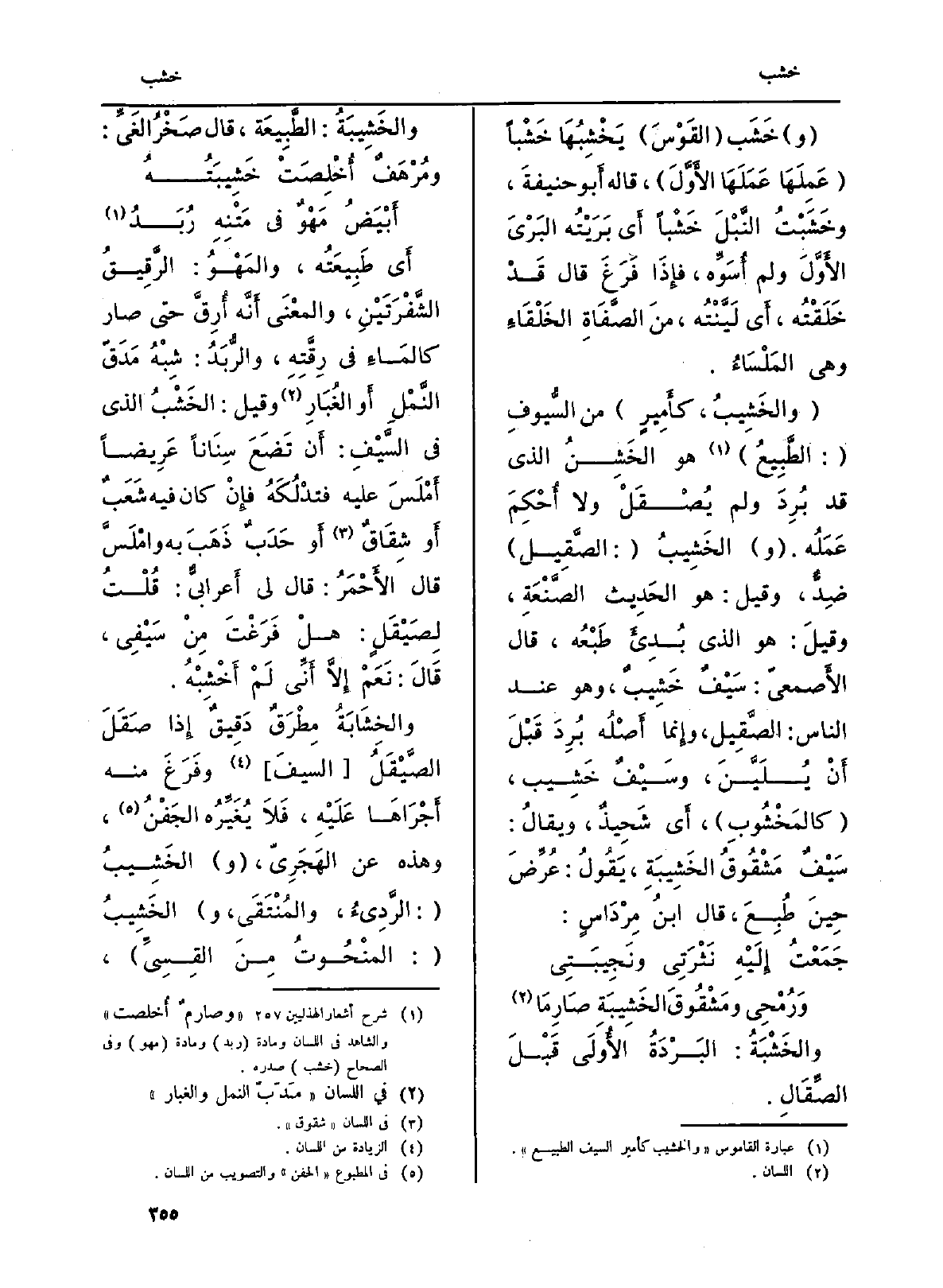 (والخَشِيبُ، كأَمِيرٍ) من السُّيوفِ (: الطَبِيعُ) هُوَ الخَشِنُ الَّذِي قد بُرِدَ وَلم يُصْقَلْ وَلَا أُحْكِمَ عَمَلُه. (و) الخَشِيبُ (: الصَّقِيل) ضِدٌّ، وَقيل: هُوَ الحَدِيث الصَّنْعَةِ، وقيلَ هُوَ الَّذِي بُدِىءَ طَبْعُه، قَالَ الأَصمعيّ: سَيْفٌ خَشِيبٌ، وَهُوَ عِنْد النَّاس: الصَّقِيلِ، وإِنما أَصْلُه بُرِدَ قَبْلَ أَنْ يُلَيَّنَ، وسَيْفٌ خَشِيب، (كالمَخْشُوبِ) ، أَي شَحِيذٌ، ويقالُ: سَيْفٌ مَشْقُوقُ الخَشِيبَةِ، يَقُولُ: عُرِّضَ حِينَ طُبِعَ، قَالَ ابنُ مِرْدَاسٍ: