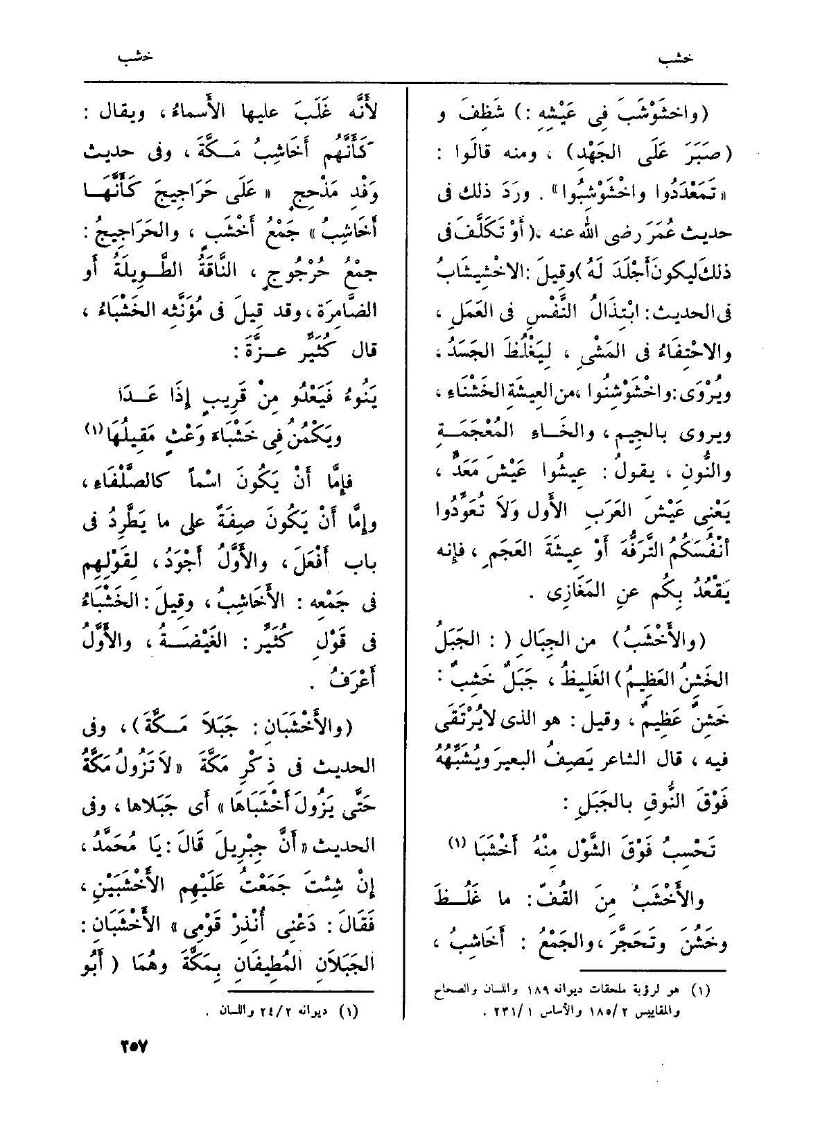 والأَخْشَبُ مِنَ القُفّ: مَا غَلُظٍ وخَشُنَ وتَحَجَّرَ، والجَمْعُ: أَخَاشِبُ، لأَنَّه غَلَبَ عَلَيْهَا الأَسماءُ، وَيُقَال: كَأَنَّهُمْ أَخَاشِبُ مَكَّةَ، وَفِي حَدِيث وَفْدِ مَذْحِجٍ (عَلَى حَرَاجِيجَ كأَنَّهَا أَخَاشِيبُ) جَمْعُ أَخْشَبٍ، والحَرَاجِيحُ: جمْعُ حُرْجُوجٍ، النَّاقَةُ الطَّوِيلَةُ أَو الضَّامِرَة، وَقد قِيلَ فِي مُؤَنَّثِه الخَشْبَاءُ، قَالَ كُثَيِّر عزَّةَ: