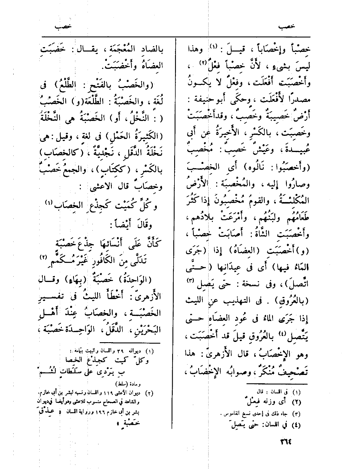 خِصْباً وإِخْصَاباً، قيلَ: وَهَذَا ليسَ بشيءٍ، لأَنَّ خِصْباً فِعْلٌ، وأَخْصَبَت أَفْعَلَت، وفِعْلٌ لَا يكونُ مصدرا لأَفْعَلت، وحكَى أَبو حنيفَة: أَرْضٌ خَصِيبَةٌ وخَصِبٌ، وَقد أَخْصَبَتْ وخَصِبَت، بالكَسْرِ، الأَخِيرَةُ عَن أَبي ع 2 بيدةَ، وعَيْشٌ خَصِبٌ: مُخْصِبٌ (وأَخصَبُوا: نَالُوه) أَيِ الخِصْبَ وصارُوا إِليه، والمُخْصِبَة: الأَرْضُ المُكْلِئَةُ، والقومُ مُخْصِبُونَ إِذا كَثُرَ طَعَامُهُم ولبَنُهُم، وأَمْرَعَتْ بلادُهم، وأَخْصَبَتِ الشَّاةُ: أَصَابَتْ خِصْباً، (و) أَخْصَبَتِ (العِضَاهُ) إِذا (جَرَى المَاءُ فِيهَا) أَي فِي عِيدَانِها (حتَّى اتَّصلَ) ، وَفِي نُسْخَة: حَتَّى يَصِل (بالعُرُوقِ) . فِي (التَّهْذِيب) عنِ اللَّيْث إِذا جَرَى الماءُ فِي عُودِ العِضَاهِ حَتَّى يَتَّصِل بالعُرُوقِ قيلَ قد أَخْصَبَت، وَهُوَ الإِخْصَابُ، قَالَ الأَزهريّ: هَذَا تَصْحِيفٌ مُنْكَرٌ، وصوابُه الإِخْضَابُ، بالضادِ المُعْجَمَةِ، يُقَال: خَضَبَتِ العِضَاهُ وأَخْضَبَتْ.