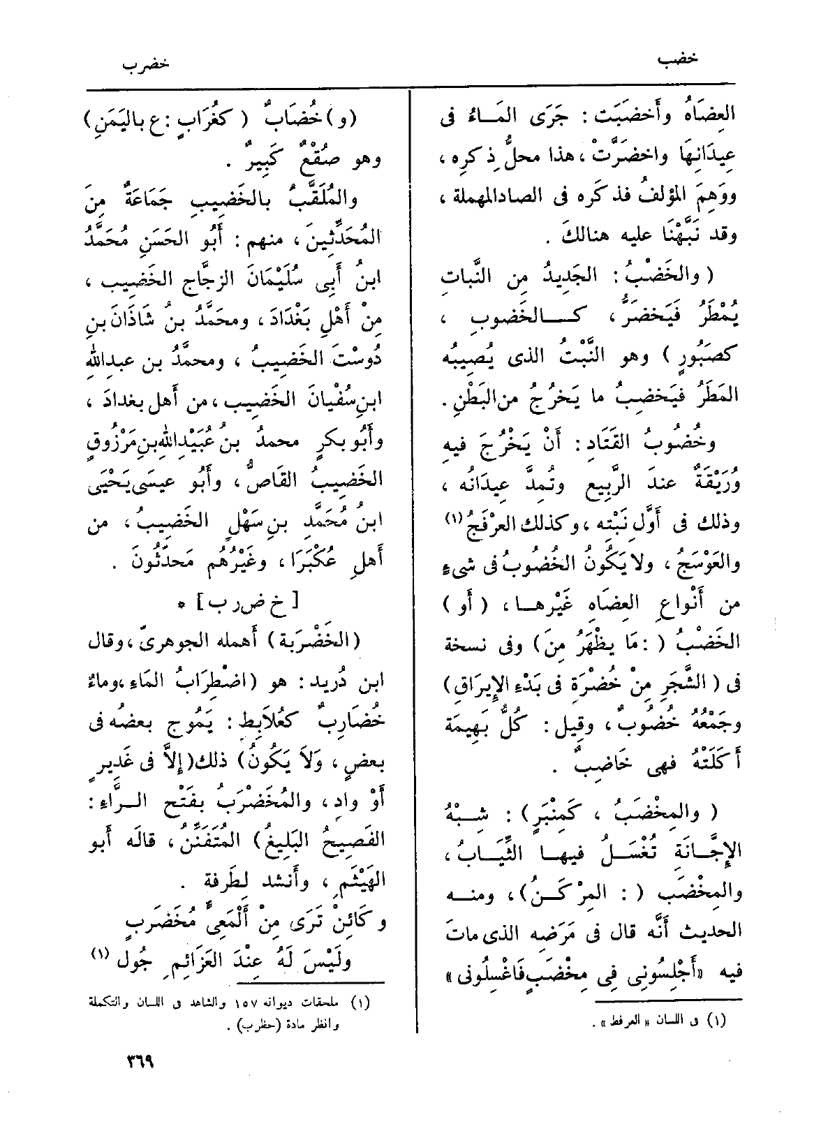 : (الخَضْرَبة) أَهمله الجوهريّ، وَقَالَ ابْن دُريد: هُوَ (اضْطِرَابُ المَاءِ، وماءٌ خُضَارِبٌ كعُلاَبِطِ: يَمُوج بعضُه فِي بعضٍ، وَلاَ يَكُونُ) ذَلِك (إِلاَّ فِي غَدِيرٍ أَوْ وادِ، والمُخَضْرَبُ بفَتْح الرَّاءِ: الفَصِيحُ البَلِيغُ) المُتَفَنِّنُ، قالَه أَبو الهَيْثَمِ، وأَنشد لِطَرفة.