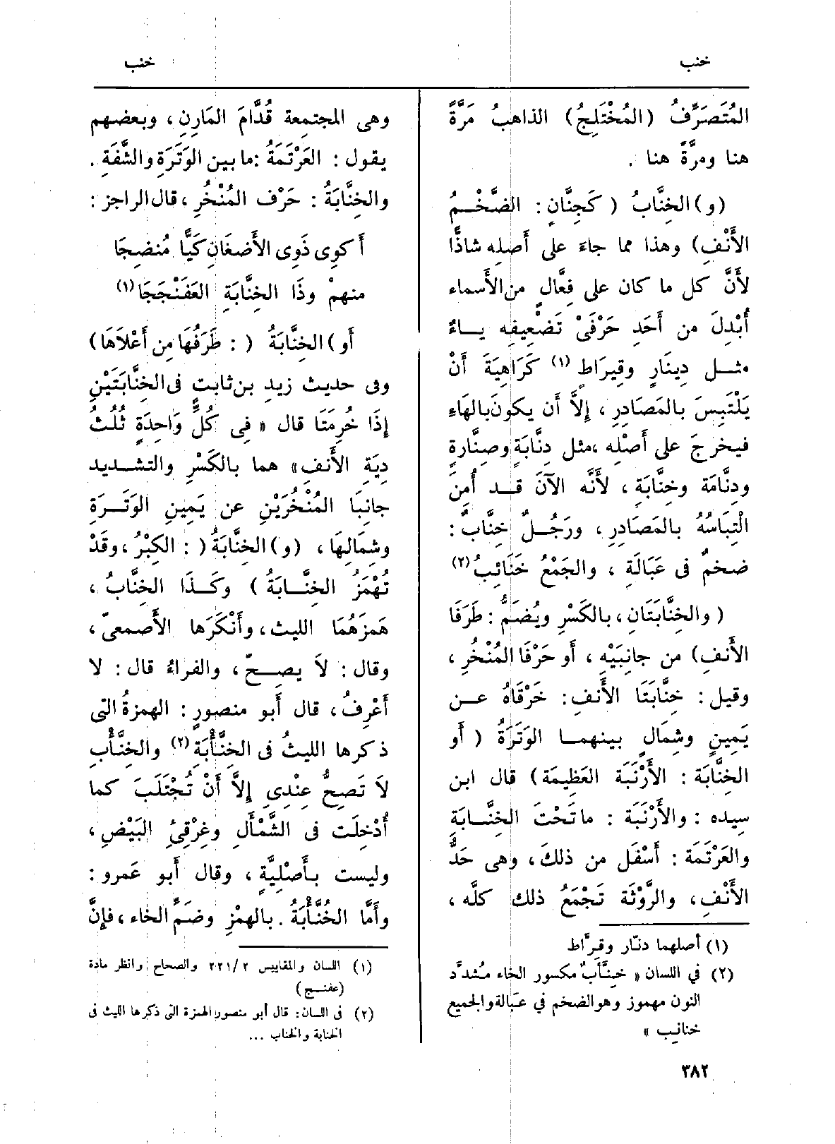(والخَنَّابَتَانِ، بالكَسْرِ ويُضَمُّ: طَرَفَا الأَنفِ) من جانِبَيْهِ، أَو حَرْفَا المُنْخُرِ، وَقيل: خِنَّابَتَا الأَنفِ: خَرْقَاهُ عَن يَمِينٍ وشِمَالٍ بَينهمَا الوَتَرَةُ (أَو الخِنَّابَة: الأَرْنَبَة العَظِيمَة) قَالَ ابْن سِيده: والأَرْنَبَة: مَا تَحْتَ الخِنَّابَةِ والعَرْتَمَة: أَسْفَل من ذلكَ، وَهِي حَدُّ الأَنْفِ، والرَّوْثَة تَجْمَعُ ذَلِك كلَّه، وَهِي المجتمِعة قُدَّامَ المَارِنِ، وَبَعْضهمْ يَقُول: العَرْتَمَةُ: مَا بَين الوَتَرَةِ والشَّفَةِ، والخِنَّابَةُ: حَرْف المُنْخُرِ، قَالَ الراجز: