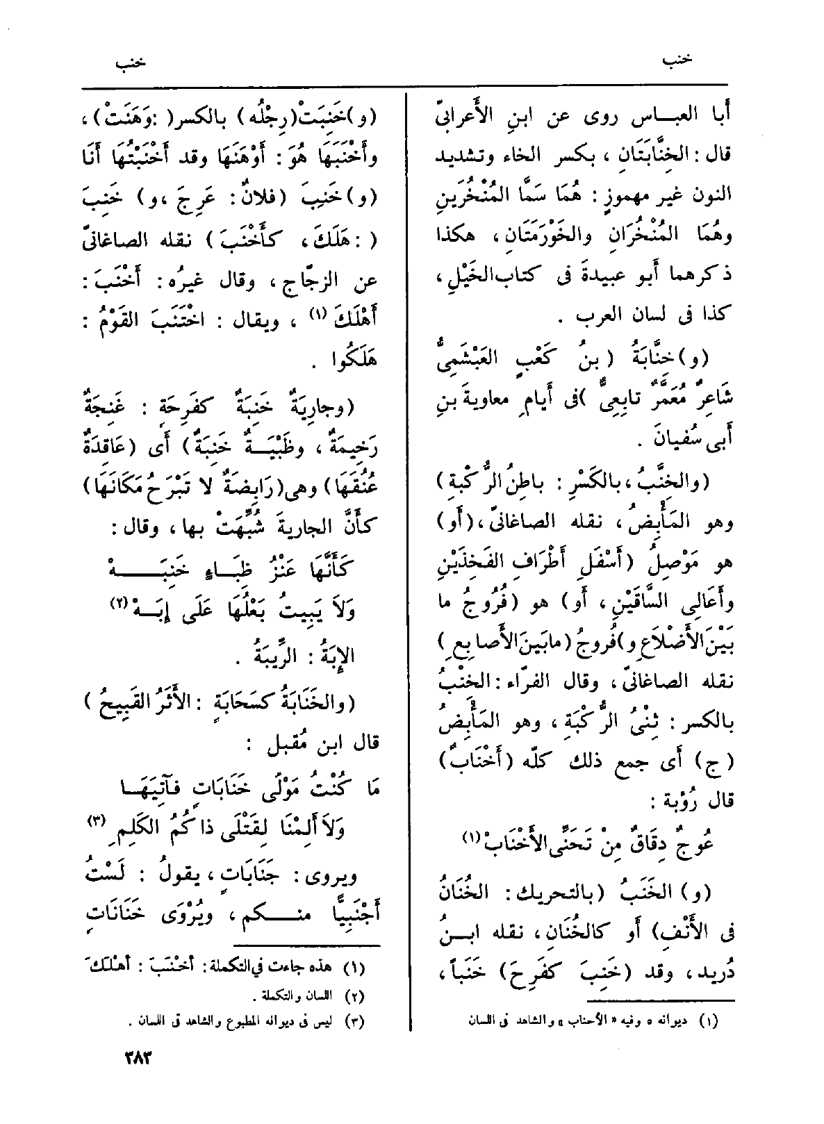 أَبا الْعَبَّاس روى عَن ابنِ الأَعرابيّ قَالَ: الخِنَّابَتَانِ، بِكَسْر الْخَاء وَتَشْديد النُّون غير مهموزٍ: هُمَا سَمَّا المُنْخُرَينِ وهُمَا المُنْخُرَانِ والخَوْرَمتانِ، هَكَذَا ذكرهمَا أَبو عبيدةَ فِي كتاب (الخَيْلِ) ، كَذَا فِي (لِسَان الْعَرَب) .