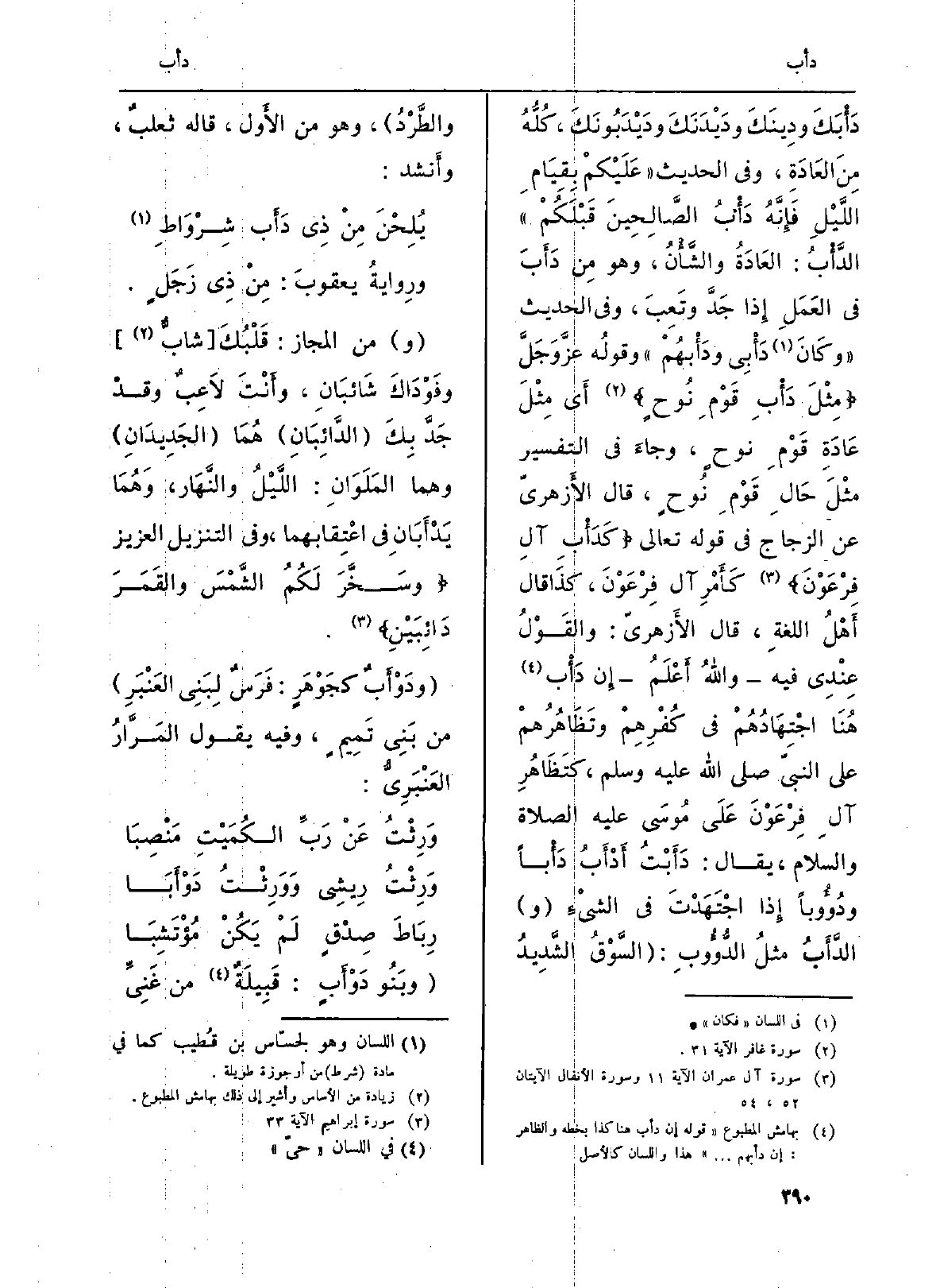 دَأْبَكَ ودِينَكَ ودَيْدَنَكَ ودَيْدَبُونَكَ، كُلُّهُ مِنَ العَادَةِ، وَفِي الحَدِيث (عَلَيْكمْ بِقِيَامِ اللَّيْلِ فَإِنَّهُ {دَأْبُ الصَّالِحِينَ قَبْلَكُمْ) } الدَّأْبُ: العَادَةُ والشَّأْنُ، وَهُوَ مِن {دَأَبَ فِي العَمَلِ إِذا جَدَّ وتَعِبَ، وَفِي الحَدِيث (وكَانَ} - دَأْبِي {ودَأْبهُمْ) وقولُه عزَّ وجلَّ {2. 027 مثل داءْب قوم نوح} (غَافِر: 31) أَي مِثْلَ عَادَةِ قَوْمِ نوحٍ، وَجَاء فِي (التَّفْسِير) مثْلَ حَالِ قَوْمِ نُوحٍ، قَالَ الأَزهريّ عَن الزّجاج فِي قَوْله تَعَالَى: {2. 027} كَدَأْبِ آل فِرْعَوْن} (آل عمرَان: 11) و (الأَنفال: 52، 54) كَأَمْرِ آل غِرْعَوْنَ، كذَا قَالَ أَهْلُ اللغةِ، قَالَ الأَزهريّ: والقَوْلُ عِنْدِي فِيهِ وَالله أَعْلَمُ إِن دَأْب هُنَا اجُتِهَادُهُمْ فِي كُفْرِهِمْ وتَظَاهُرُهمْ على النبيّ صلى الله عَلَيْهِ وَسلم كتَظَاهُرِ آلِ فِرْعَوْنَ عَلَى مُوسَى عَلَيْهِ الصَّلَاة وَالسَّلَام، يُقَال: {دَأَبْتُ} أَدأَبُ {دَأْباً} ودُؤُوباً إِذا اجْتَهَدْتَ فِي الشيْءِ (و) الدَّأَبُ مثلُ {الدُّؤُوبِ: (السَّوْقُ الشَّدِيدُ والطَّرْدُ) ، وَهُوَ من الأَول، قَالَه ثعلبٌ، وأَنشد: