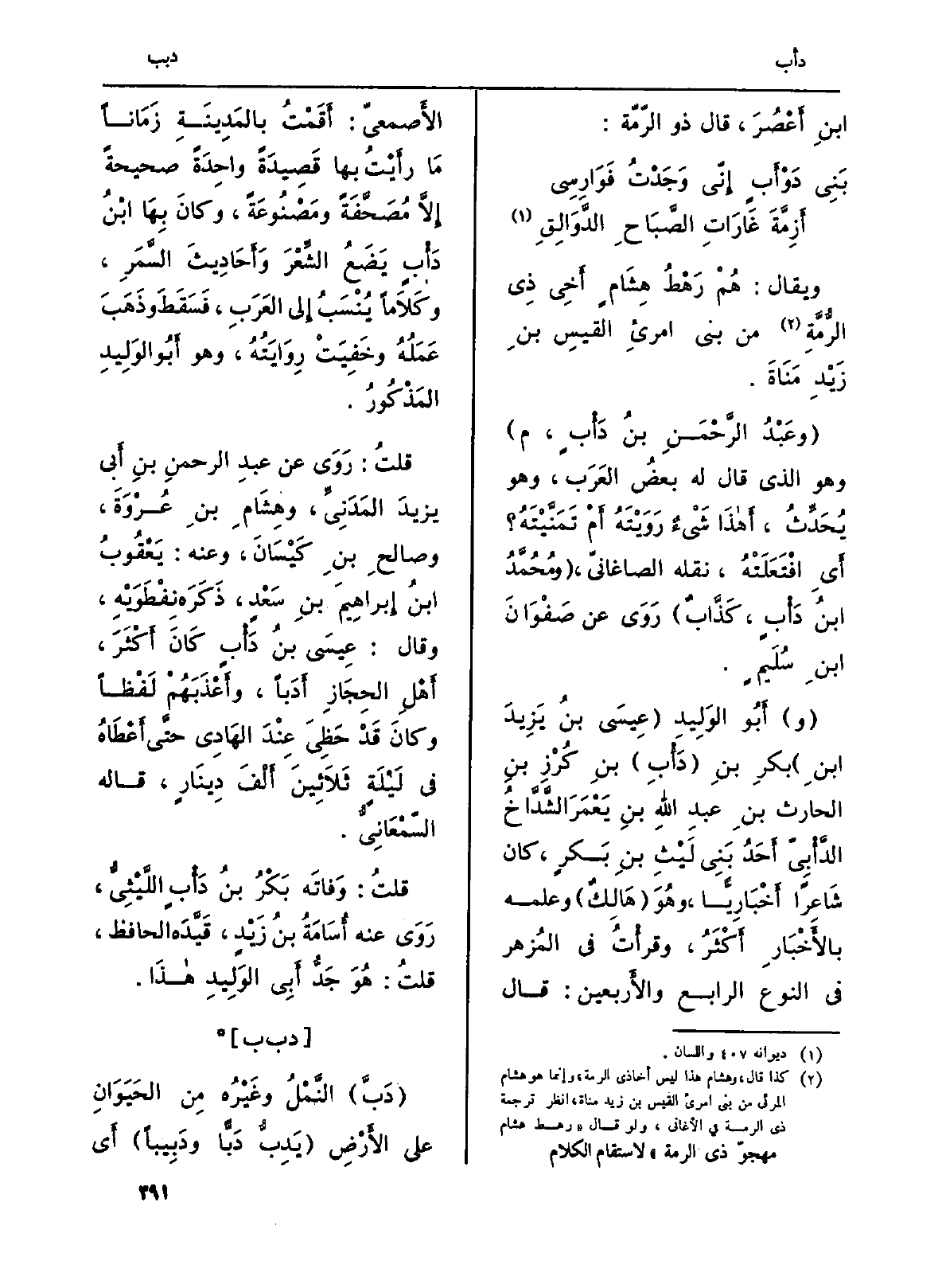 (وعَبْدُ الرَّحْمَنِ بنُ دَأْبٍ، م) وَهُوَ الَّذِي قَالَ لَهُ بعضُ العَرَب، وَهُوَ يُحَدِّثُ، أَهاذَا شَيْءٌ رَوَيْتَهُ أَمْ تَمَنَّيْتَهُ؟ أَيِ افْتَعَلَتْهُ، نَقله الصاغانيّ، (ومُحمَّدُ بنُ دَأْبٍ، كَذَّابٌ) رَوَى عَن صَفْوَانَ بنِ سُلَيمٍ.
