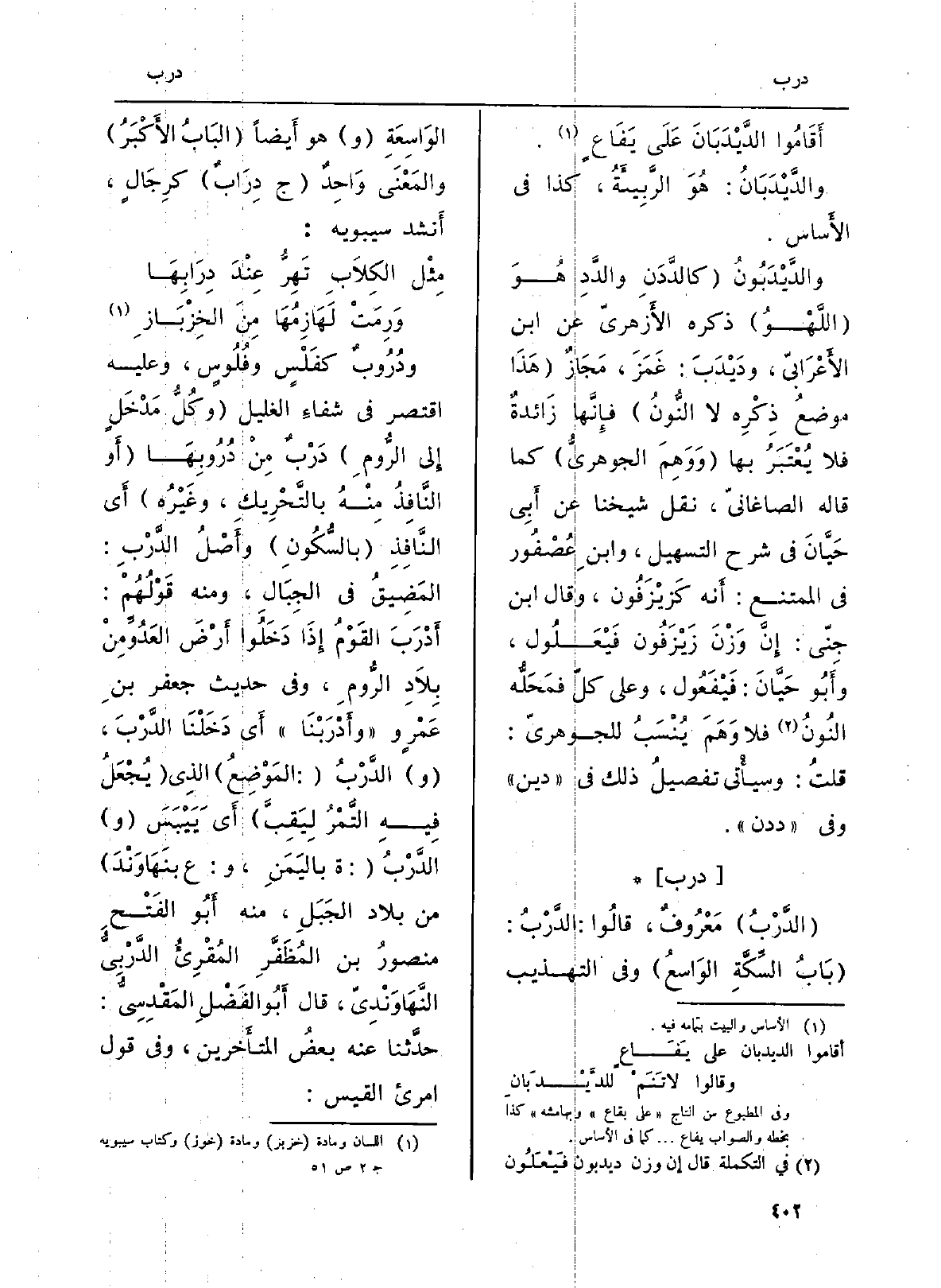 ودُرُبٌ كفَلْسٍ وفُلُوسٍ، وَعَلِيهِ اقْتصر فِي شفاءِ الغليل (وكُلُّ مَدْخَلٍ إِلى الرُّومِ) دَرْبٌ مِنْ دُرُوبِهَا (أَو النَّافِذُ مِنْهُ بالتَّحْرِيكِ، وغَيْرُه) أَي النَّافِذِ (بالسُّكُونِ) وأَصْلُ الدَّرْبِ: المَضِيقُ فِي الجِبَالِ، وَمِنْه قَوْلُهُمْ: أَدْرَبَ القَوْمُ إِذَا دَخَلُوا أَرْضَ العَدُوِّ مِن بِلاَدِ الرُّومِ، وَفِي حَدِيث جَفر بنِ عَمْرٍ و (وأَدْرَبْنَا) أَي دَخَلْنا الدَّرْبَ، (و) الدَّرْبُ (: المَوْضِعُ) الذِي (يُجْعَلُ فِيهِ التَّمْرُ لِيَقِبَّ) أَي يَيْبَسَ (و) الدَّرْبُ) (: ة باليَمَنِ، و: ع بنَهَاوَنْدَ) من بِلَاد الجَبَلِ، مِنْهُ أَبو الفَتْحُ منصورُ بن المُظَفَّرِ المُقْرِىءُ الدَّرْبِيُّ النَّهَاوَنْدِيّ، قَالَ أَبُو الفَضْلِ المَقْدِسِيُّ: حدَّثنا عَنهُ بعضُ المتأَخرين، وَفِي قَول امرىء الْقَيْس: