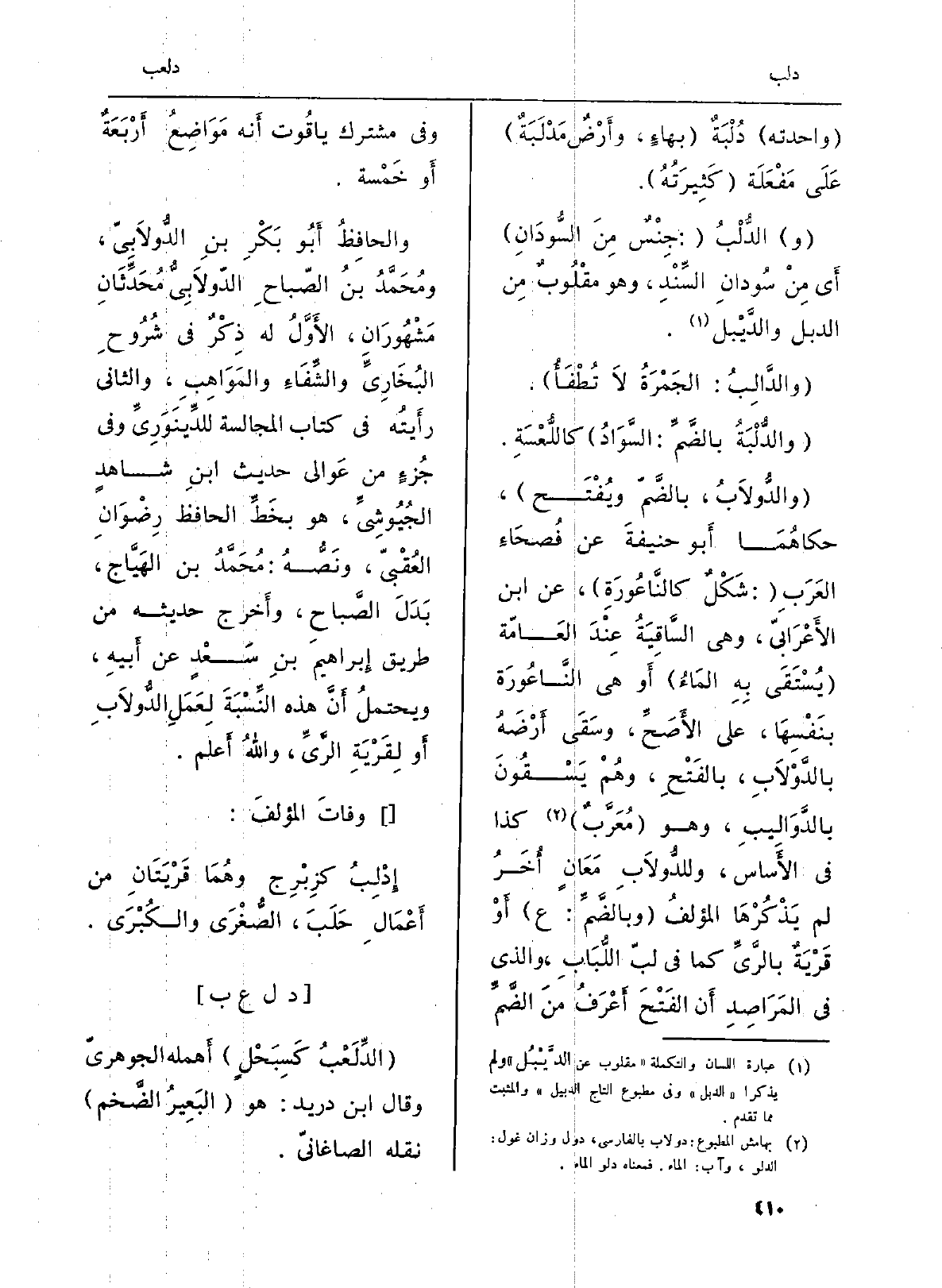 (والدُّولاَبُ، بالضَّمّ ويُفْتَح) ، حكاهُمَا أَبو حنيفةَ عَن فُصحَاءِ العَرَبِ (: شَكْلٌ كالنَّاعُورَةِ) ، عَن ابْن الأَعْرَابيّ، وَهِي السَّاقِيَةُ عِنْدَ العَامّة (يُسْتَقَى بِهِ المَاءِ) أَو هِيَ النَّاعُورَة بنَفْسِهَا، على الأَصَحِّ، وسَقَى أَرْضَهُ بالدَّوْلاَبِ، بالفَتْحِ، وهُمْ يَسْقُونَ بالدَّوَالِيبِ، وَهُوَ (مُعَرَّبٌ) كَذَا فِي (الأَساس) ، وللدُّولاَبِ مَعَانٍ أُخَرُ لم يَذْكُرْهَا الْمُؤلف (وبالضَّمِّ: ع) أَوْ قَرْيَةٌ بالرَّيِّ كَمَا فِي (لبّ اللُّبَابِ) ، وَالَّذِي فِي (المَرَاصِدِ) أَن الفَتْحَ أَعْرَفُ منَ الضَّمِّ وَفِي مُشْتَرك ياقُوت أَنه مَوَاضِعُ أَرْبَعَةٌ أَو خَمْسة.