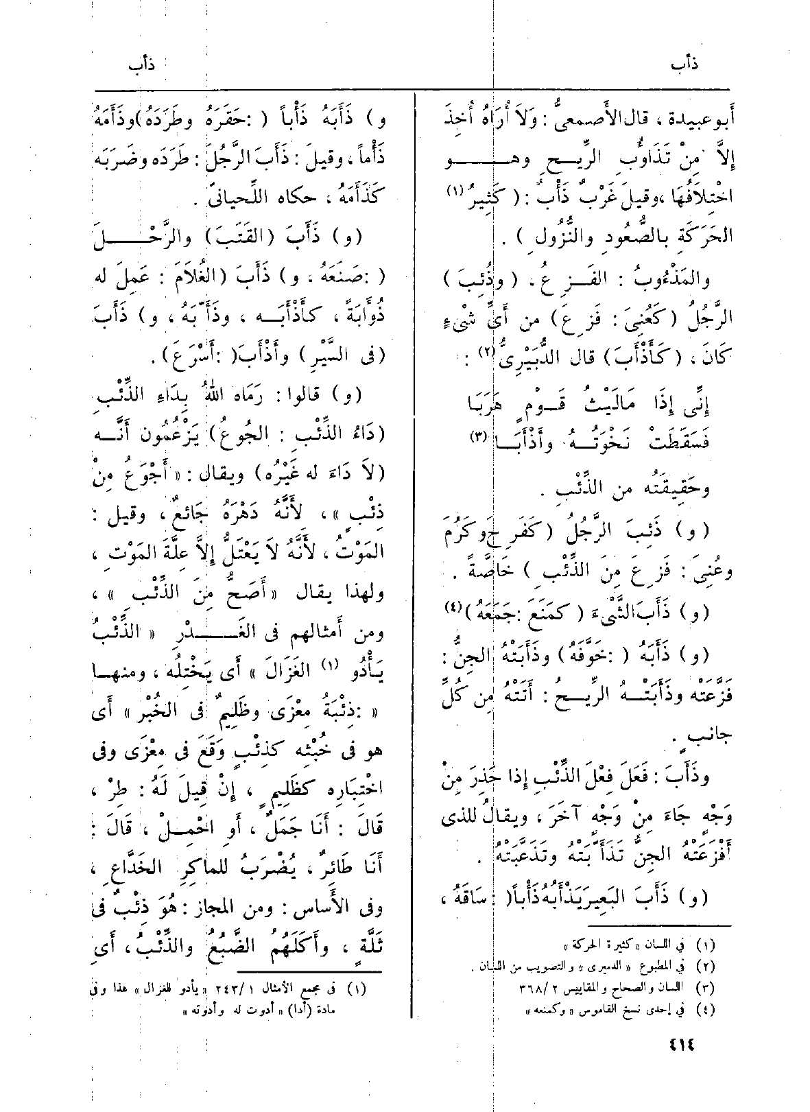 أَبو عُبَيْدَة، قَالَ الأَصمعيُّ: وَلاَ أُرَاهُ أُخِذَ إِلاَّ مِنْ {تَذَاؤُبِ الرِّيحِ وَهُوَ اخْتِلاَفُهَا، وقيلَ غَرْبٌ} ذَأْبٌ: (كَثِيرُ الحَرَكَةِ بالصُّعُودِ والنُّزُولِ) .