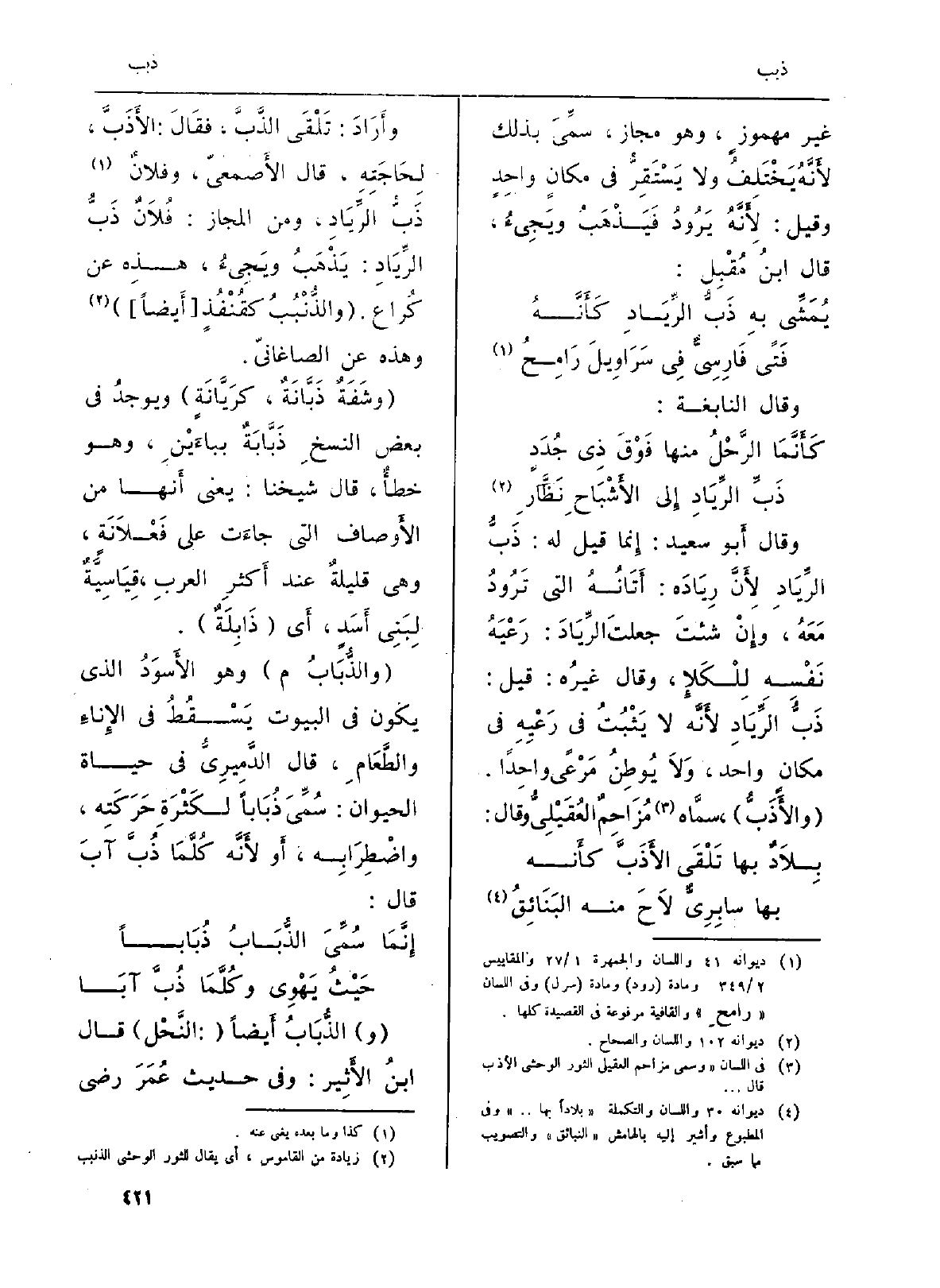 وَقَالَ أَبو سعيد: إِنما قيل لَهُ: ذَبُّ الرِّيَادِ لاِءَنَّ رِيَادَه: أَتَانُهُ الَّتِي تَرُودُ مَعَهُ، وإِنْ شئتَ جعلتَ الرِّيَادَ: رَعْيَهُ نَفْسِهِ لِلْكَلإِ، وَقَالَ غيرُه: قيل: ذَبُّ الرِّيَادِ لأَنَّه لَا يَثْبُتُ فِي رَعْيِهِ فِي مكانٍ وَاحِد، وَلاَ يُوطِنُ مَرْعًى واحِداً، ( {والأَذَبُّ) ، سمَّاه مُزَاحِمٌ العُقَيْلِيُّ وَقَالَ: