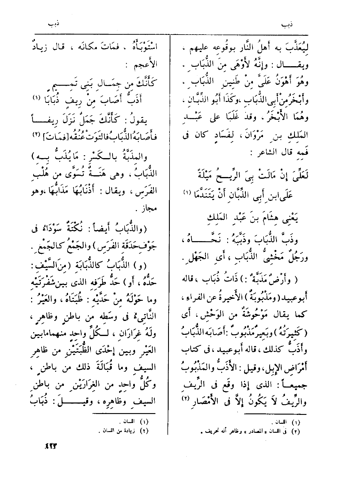 (و) الذُّبَابُ كالذُّبَابَةِ (مِنَ السَّيْفِ: حَدُّهُ، أَو) حَدُّ طَرَفِهِ الَّذِي بَين شَفْرَتَيْهِ وَمَا حَوْلَهُ مِنْ حَدَّيْهِ: ظُبَتَاهُ، والعَيْرُ: النَّاتِيءُ فِي وسَطِه من باطنٍ وظاهِرٍ، ولَهُ غِرَارَانِ، لكُلِّ واحِدٍ مِنْهُمَا مَا بَين العَيْرِ وَبَين إِحْدَى الظُّبَتَيْنِ من ظاهِرِ السَّيفِ وَمَا قُبَالَةَ ذَلِك من باطنٍ، وكُلُّ واحِدٍ من الغِرَارَيْنِ من باطنِ السيفِ وظاهِرِ، وقيلَ: ذُبَابُ