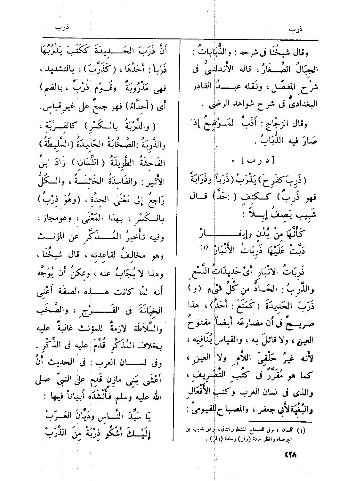{ذَرِبَاتُ الانْبَارِ أَيْ حَدِيدَاتُ اللَّسْعِ} والذَّرِبُ: الحَادُّ من كُلِّ شيْءٍ (و) ذَرَبَ الحَدِيدَةَ (كَمَنَعَ: أَحَدَّ) ، هَذَا صريحٌ فِي أَن مضارعَه أَيضاً مفتوحُ الْعين، وَلَا قائلَ بِهِ، وَالْقِيَاس يُنَافِيه، لأَنه غيرُ حَلْقِيّ اللاَّمِ وَلَا العينِ، كَمَا هُوَ مُقَرَّرٌ فِي كُتبِ التَّصْرِيفِ، وَالَّذِي فِي (لِسَان الْعَرَب) وَكتب (الأَفْعَالِ والبُغْيَة) لأَبي جَعْفَر، و (الْمِصْبَاح) للفيوميّ: أَنَّ ذَرَبَ الحَدِيدَةَ كَكَتَبَ {يَذْرُبُهَا ذَرْباً: أَحَدَّهَا، (كَذَرَّبَ) ، بِالتَّشْدِيدِ، فَهِيَ} مَذْرُوبَةٌ وقَوْم {ذُرْبٌ، بِالضَّمِّ) أَي (أَحِدَّاءُ) فَهُوَ جمعٌ على غيرِ قياسٍ.