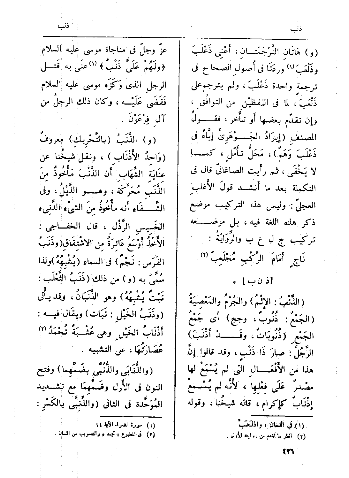 : (الذَّنْبُ: الإِثْمُ) والجُرْمُ والمَعْصِيَةُ (الجَمْعُ: ذُنُوبٌ، وجج) أَي جَمْعُ الجَمْعِ (ذُنُوبَاتٌ، وقَدْ أَذْنَبَ) الرّجُلُ: صارَ ذَا ذَنْبٍ، وَقد قَالُوا إِنَّ هَذَا من الأَفْعَالِ الَّتِي لم يُسْمَعْ لَهَا مصْدرٌ عَلَى فِعْلِهِا، لأَنَّه لم يُسْمعْ إِذنَابٌ كإِكرام، قَالَه شيخُنا. وَقَوله عزّ وجلْ فِي مُنَاجَاة مُوسَى عَلَيْهِ السَّلَام {2. 030 وَلَهُم على ذَنْب} (الشُّعَرَاء: 14) عنَى بِهِ قَتل الرجلِ الَّذِي وَكَزَه مُوسَى عَلَيْهِ السَّلَام فَقَضَى عَلَيْه، وَكَانَ ذَلِك الرجلُ من آلِ فِرْعَوْنَ.