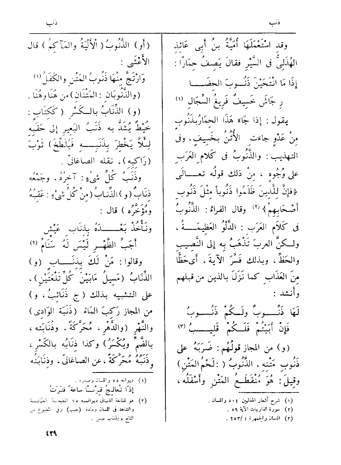يَقُول: إِذا جَاءَ هَذَا الحِمَارُ بذَنُوبٍ مِنْ عَدْوٍ جاءَتِ الأُتُنُ بخَسِيفٍ، وَفِي (التَّهْذِيب) والذَّنُوبُ فِي كَلامِ العَرَبِ على وُجُوهٍ، مِنْ ذَلِك قولُه تعالَى: {2. 030 فان للَّذين. . اءَصحابهم} (الذاريات: 59) وَقَالَ الفراءُ: الذَّنُوبُ فِي كَلاَمِ العَرَبِ: الدَّلْوُ العَظِيمَةُ، ولكنَّ العربَ تَذْهَبُ بِه إِلى النَّصِيبِ والحَظِّ، وَبِذَلِك فَسَّرَ الأَيةَ، أَي حَظًّا مِنَ العَذَابِ كَمَا نَزَلَ بالذين من قبلهم وأَنشد: