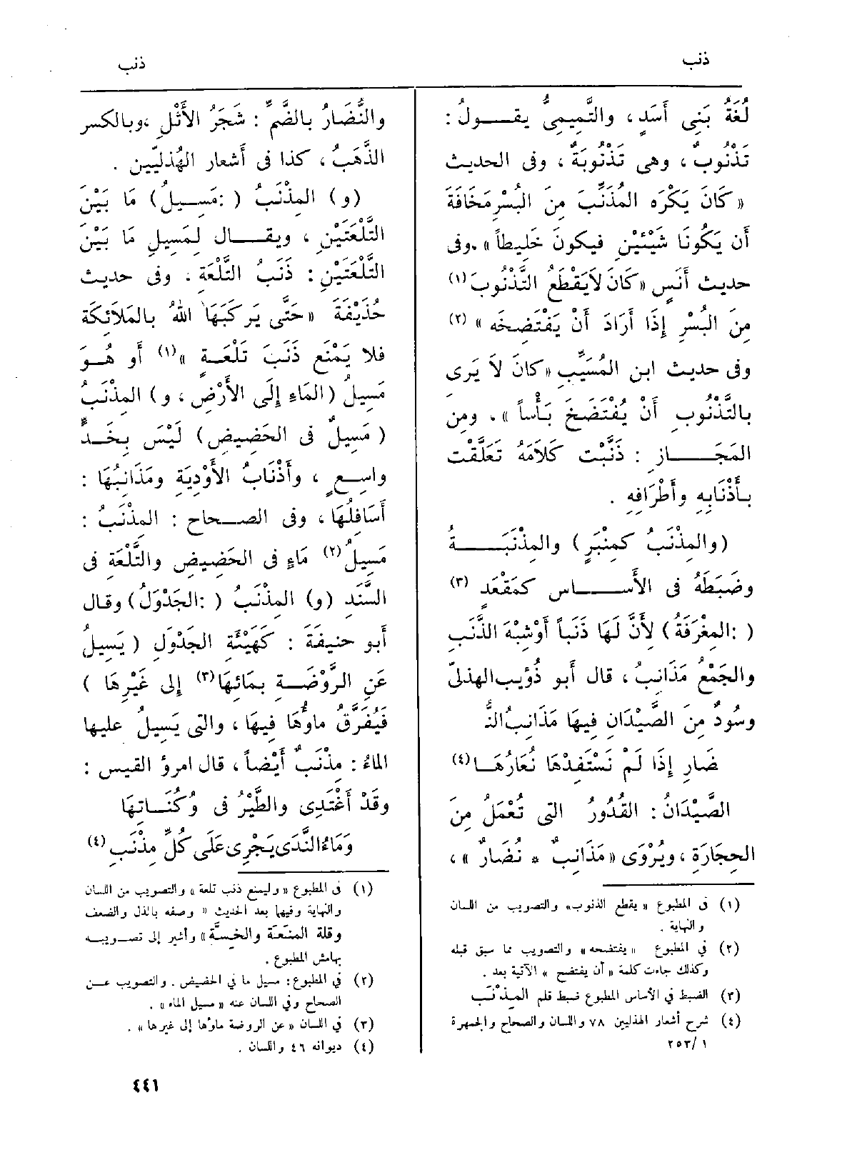 لِغَةُ بَني أَسَدٍ، والتَّمِيمِيُّ يقولُ: تَذْنُوبٌ، وَهِي تَذْنُوبَةٌ، وَفِي الحَدِيث (كَانَ يَكْرَه المُذَنِّبَ مِنَ البُسْرِ مَخَافَةَ أَن يَكُونَا شَيْئيْنِ فَيكون خَلِيطاً) ، وَفِي حَدِيث أَنسٍ (كَانَ لاَ يَقْطَعُ التَّذْنُوبَ مِنَ البُسْرِ إِذَا أَرَادَ أَنْ يَفْتَضِخَه) وَفِي حَدِيث ابْن المُسَيِّبِ (كانَ لاَ يَرَى بالتَّذْنُوبِ أَنْ يُفْتَضَخَ بَأْساً) ، ومِنَ المَجَازِ: ذَنَّبْت كَلاَمَهُ تَعَلَّقْت بأَذْنَابِهِ وأَطْرَافِهِ.