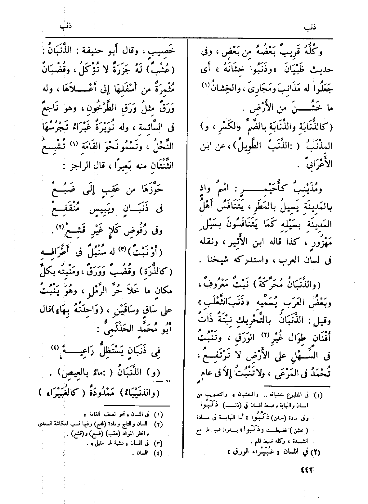 (والذَّنَبَانُ مُحَرَّكَةً) نَبْتٌ مَعْرُوفٌ، وبَعْضُ العَرَبِ يُسَمِّيهِ (ذَنَبَ الثَّعْلَبِ) وَقيل: الذَّنَبَانُ بالتَّحْرِيكِ نِبْتَةٌ ذَاتُ أَفْنَانٍ طِوعال غُبْرِ الوَرَقِ، وتَنْبُتُ فِي السَّهْلِ على الأَرْضِ لَا تَرْتَفِعُ، تُحْمَدُ فِي المَرْعَى، وَلَا تَنْبُتُ إِلاّ فِي عامٍ خَصِيبٍ، وَقَالَ أَبو حنيفَة: الذَّنَبَانُ: (عُشْبٌ) لَهُ جَزَرَةٌ لَا تُؤْكَلُ، وقُضْبَانٌ مُثْمِرَةٌ من أَسْفَلِهَا إِلى أَعْلاَهَا، وَله وَرَقٌ مِثْلُ وَرَقِ الطَّرْخُونِ، وَهُوَ نَاجعٌ فِي السَّائِمةِ، وَله نُوَيْرَةٌ غَبْرَاءُ تَجْرُسُهَا النَّحْلُ، وتَسْمُو نَحْوَ القَامَةِ تُشْبِعُ الثِّنْتَانِ مِنْهُ بَعِيراً، قَالَ الراجز: