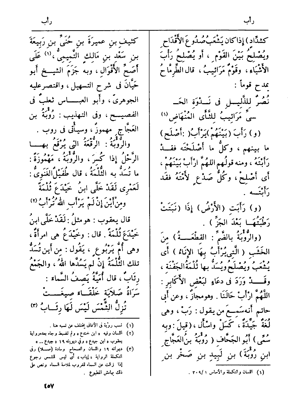 ( {والرُّؤْبَةُ بالضَّمِّ: القِطْعَةُ) مِنَ الخَشَبِ (الَّتِي} يُرْأَبُ بِهَا الإِنَاءِ) أَي يُشْعَبُ ويُصْلَحُ ويُسَدُّ بهَا ثُلْمَةُ الجَفْنَةِ، وقَدْ وَرَدَ فِي دعَاءٍ لبَعْضِ الأَكَابِرِ: اللَّهُمَّ ارْأَبْ حَالَنَا. وَهُوَ مجازٌ، وَعَن أَبي حَاتِم أَنه سَمِعَ من يَقُول: رَبْ، وَهِي لُغَةٌ جَيِّدَةٌ، كَسَلْ واسْأَل، (قِيلَ: وبِه سُمِّي: أَبُو الحَجَّافِ ( {رُؤْبَةُ بنُ العَجَّاجِ بنِ رُؤْبَةَ) بنِ لَبِيدِ بنِ صَخْر بنِ كثيفِ بنِ عميرَةَ بنِ حُنَيِّ بنِ رَبِيعَةَ بنِ سَعْدِ بنِ مَالِكٍ التَّمِيمِيُّ، عَلَى أَصَحِّ الأَقْوَالِ، وَبِه جَزَمَ الشَّيْخ أَبو حَيَّانَ فِي (شرح التسهيل) ، وَاقْتصر عَلَيْهِ الجوهريّ، وأَبو الْعَبَّاس ثعلبٌ فِي الفصيح، وَفِي (التَّهْذِيب) : رُؤْبَةُ بن العَجَّاجِ مهموزٌ، وسيأْتي فِي روب.