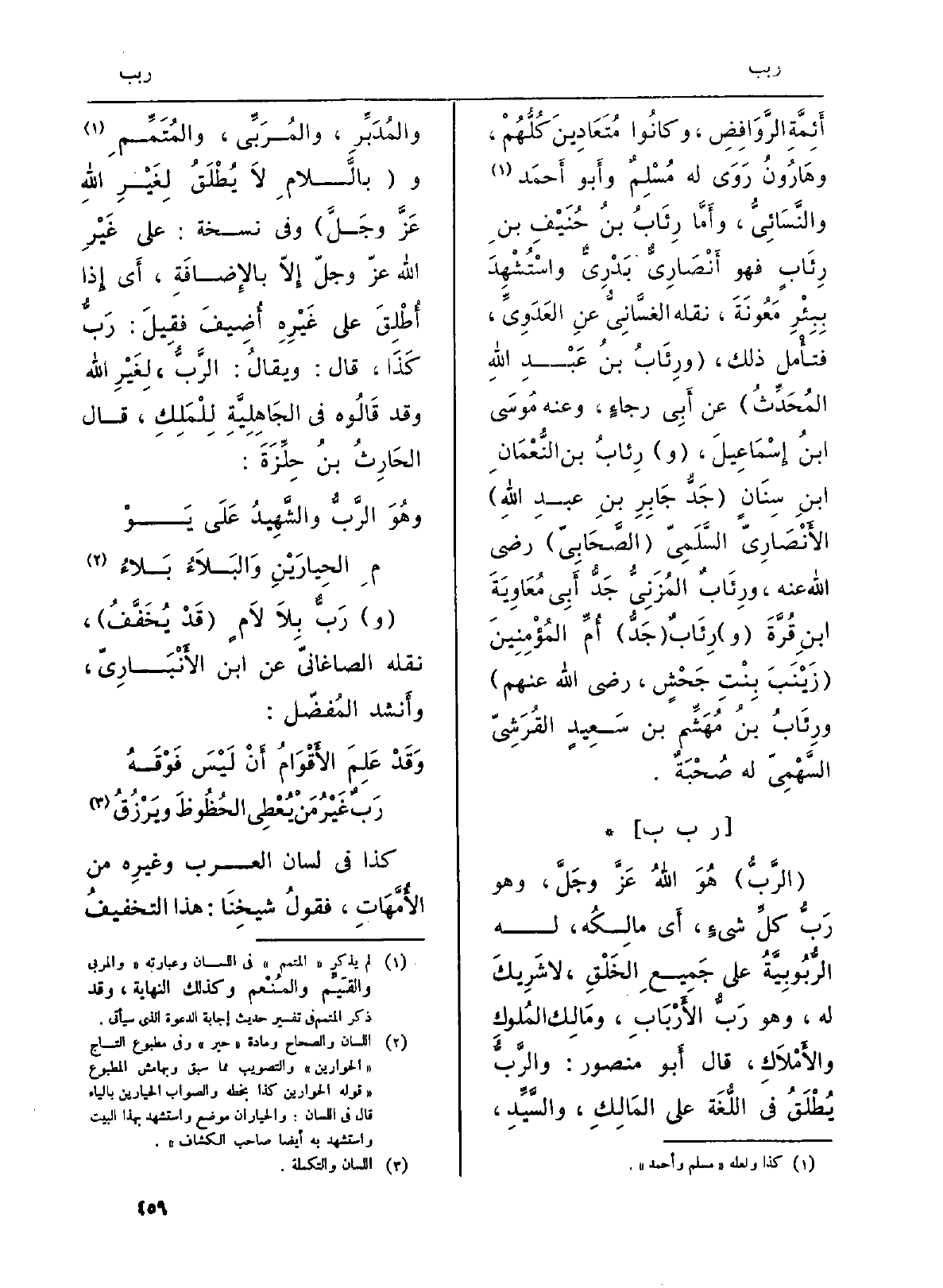 : ( {الرَّبُّ) هُوَ اللَّهُ عَزَّ وجلَّ، وَهُوَ} رَبُّ كلِّ شيءٍ، أَي مالِكُه، لَهُ {الرُّبُوبِيَّةُ على جَمِيعِ الخَلْقِ، لَا شَرِيكَ لَهُ، وَهُوَ رَبُّ} الأَرْبَابِ، ومَالِك المُلوكِ والأَمْلاَكِ، قَالَ أَبو مَنْصُور:! والرَّبُّ يُطْلَقُ فِي اللُّغَة على المَالِكِ، والسَّيِّدِ، والمُدَبِّرِ، والمُرَبِّي، والمُتَمِّمِ و (بالَّلامِ لاَ يُطْلَقُ لِغَيْرِ اللَّهِ عَزَّ وجَلَّ) وَفِي نُسْخَة: على غَيْرِ الله عزّ وجلّ إِلاّ بالإِضافَةِ، أَي إِذا أُطْلِقَ على غَيْرِهِ أُضِيفَ فقِيلَ: رَبُّ كَذَا، قَالَ: ويقالُ: الرَّبُّ، لِغَيْرِ الله وَقد قَالُوه فِي الجَاهِلِيَّةِ لِلْمَلِكِ، قَالَ الحَارِثُ بنُ حِلِّزَةَ: