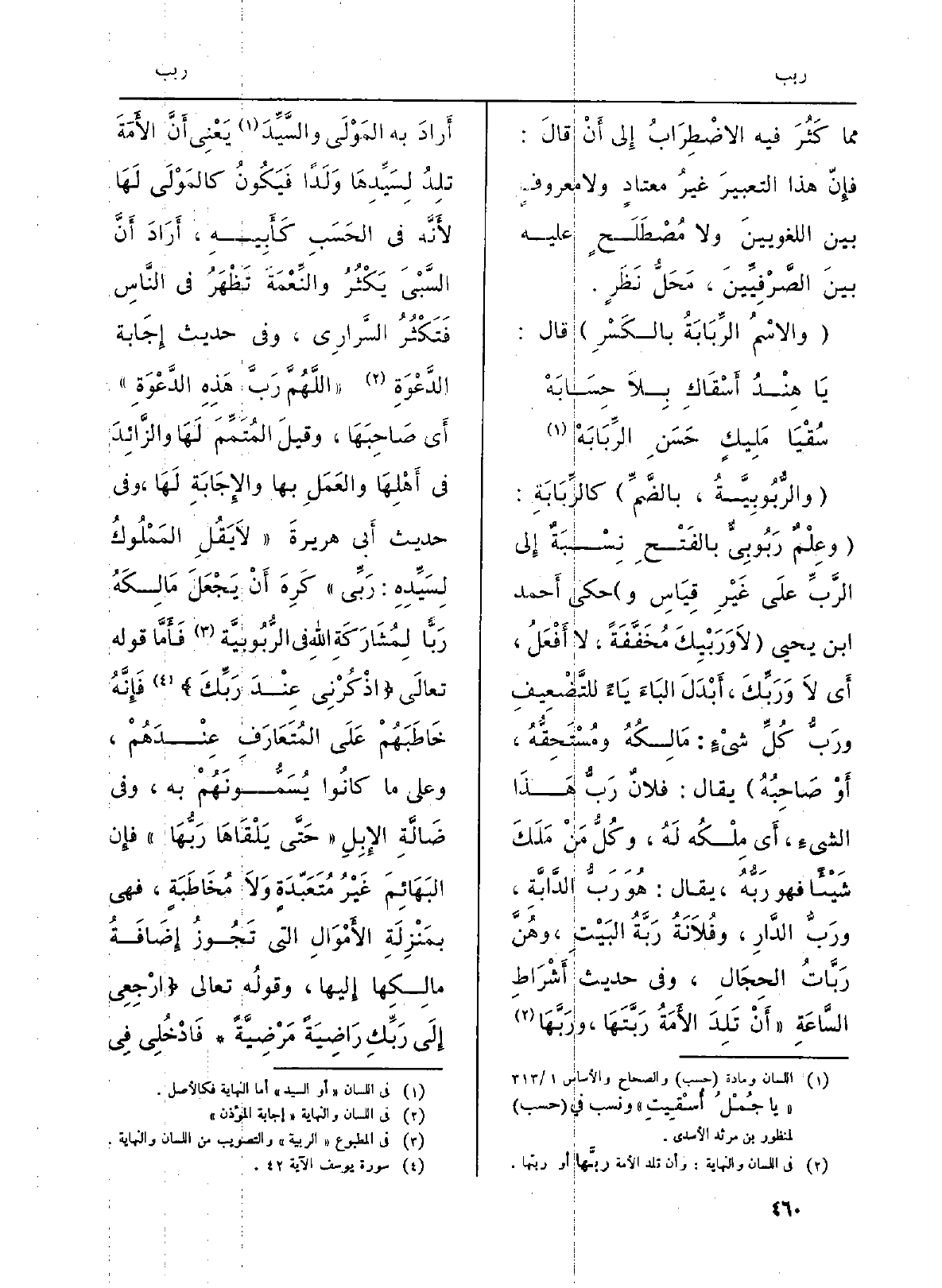 (} والرُّبُوبِيَّةُ، بالضَّمِّ) {كالرِّبَابَةِ: (وعِلْمٌ} - رَبُوبِيٌّ بالفَتْحِ نِسْبَةٌ إِلى الرَّبِّ علَى غَيْرِ قِيَاسِ و) حكى أَحمد بن يحيى (لاَ {وَرَبْيِكَ مُخَفَّفَةً، لَا أَفْعَلُ، أَي لاَ} وَرَبِّكَ، أَبْدَلَ البَاءَ بَاءً للتَّضْعِيفِ ورَبُّ كُلِّ شيْءٍ: مَالِكُهُ ومُسْتَحِقُّهُ، أَو صَاحِبُهُ) يُقَال فلانٌ رَبُّ هَذَا الشيءِ، أَي مِلْكُه لَهُ، وكُلُّ مَنْ مَلَكَ شَيْئاً فَهُوَ {رَبُّهُ، يُقَال: هُوَ رَبُّ الدَّابَّةِ،} ورَبُّ الدَّارِ، وفُلاَنَةُ {رَبَّةُ البَيْتِ، وهُنَّ} رَبَّاتُ الحِجَالِ، وَفِي حَدِيث أَشْرَاطِ السَّاعَةِ (أَنْ تَلِدَ الأَمَةُ {رَبَّتَهَا،} ورَبَّهَا أَرادَ بِهِ المَوْلَى والسَّيِّدَ يَعْنِي أَنَّ الأَمَةَ تلِدُ لِسَيِّدِهَا وَلَداً فَيَكُونُ كالمَوْلَى لَهَا لأَنَّه فِي الحَسَبِ كَأَبِيهِ، أَرَادَ أَنَّ السَّبْيَ يَكْثُرُ والنِّعْمَةَ تَظْهَرُ فِي النَّاسِ فَتَكْثُرُ السَّرارِي، وَفِي حَدِيث إِجَابة الدَّعْوَةِ (اللَّهُمَّ رَبَّ هَذِهِ الدَّعْوَةِ) أَي صَاحِبَهَا، وقيلَ المُتَمِّمَ لَهَا والزَّائِدَ فِي أَهْلِهَا والعَمَلِ بهَا والإِجَابَةِ لَهَا، وَفِي حَدِيث أَبي هريرةَ: (لاَ يَقُلِ المَمْلُوكُ لِسَيِّدِهِ: {- رَبِّي) كَرِهَ أَنْ يَجْعَلَ مَالِكَهُ رَبًّا لِمُشَارَكَةِ اللَّهِ فِي الرُّبُوبيَّة فَأَمَّا قَوْله تَعَالَى: {اذْكُرْنِى عِندَ} رَبِّكَ} (يُوسُف: 42) فَإِنَّهُ خَاطَبَهُمْ عَلَى المُتَعَارَفِ عِنْدَهُمْ، وعَلى مَا كانُوا يُسَمُّونَهُمْ بِهِ، وَفِي ضَالَّةِ الإِبِلِ (حَتَّى يَلْقَاهَا {رَبُّهَا) فإِن البَهَائِمَ غَيْرُ مُتَعَبّدَةٍ وَلاَ مُخَاطَبَةٍ، فَهِيَ بمَنْزِلَةِ الأَمْوَالِ الَّتِي تَجُوزُ إِضَافَةُ مكالِكِها إِليها، وقولُه تَعَالَى: {2. 032 ارجعي الى} َرِّبِكِ راضية مرضية} 2. 032 {فادخلي فِي