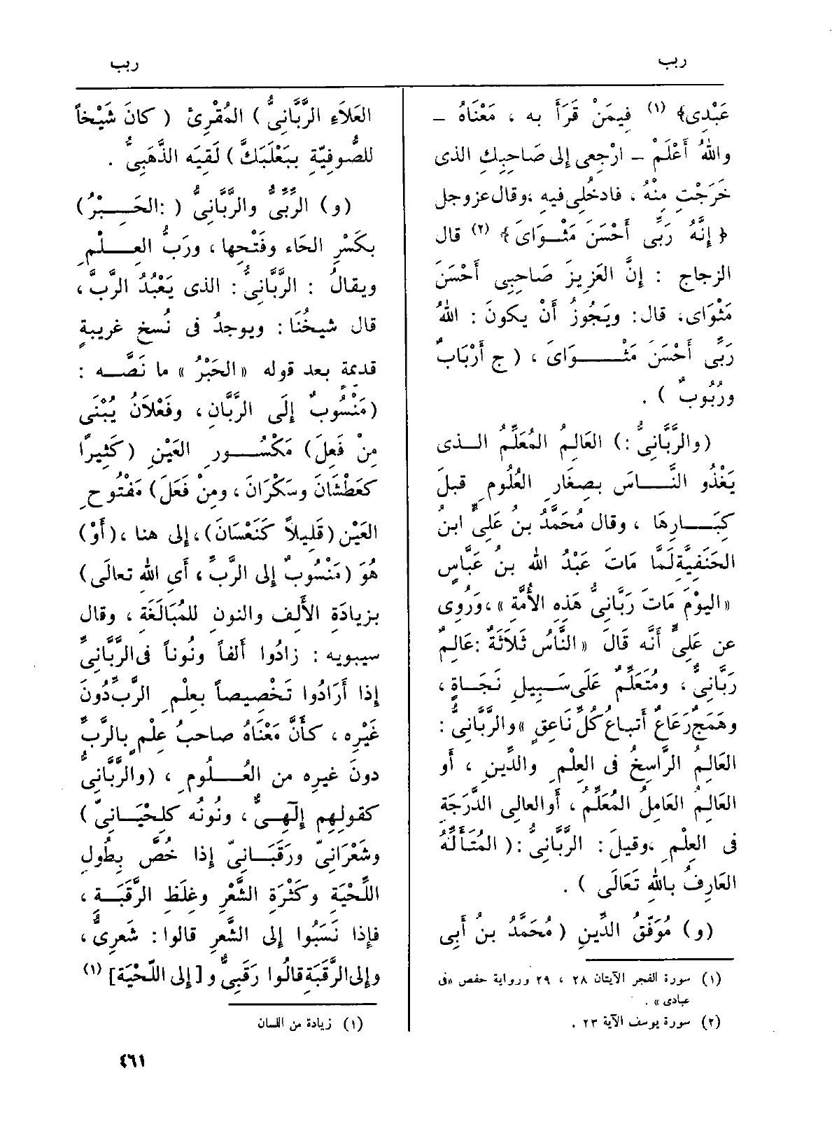 (و) } الرِّبِّيُّ والرَّبَّانِيُّ (: الحَبْرُ) بكَسْرِ الحَاء وفَتْحِها، ورَبُّ العِلْمِ ويقالُ: الرَّبَّانِيُّ: الَّذِي يَعْبُدُ الرَّبَّ، قَالَ شيخُنَا: ويوجدُ فِي نُسخ غريبةٍ قديمَة بعد قَوْله: (الحَبْرُ) مَا نعصَّه: (مَنْسُوبٌ إِلَى {الرَّبَّانِ، وفَعْلاَنُ يُبْنَى مِنْ فَعِلَ) مَكْسُورِ العَيْنِ (كَثِيراً كعَطْشَانَ وسَكْرَانَ، ومِنْ فَعَلَ) مَفْتُوحِ العَيْن (قَلِيلاً كَنَعْسَانَ) ، إِلى هُنَا، (أَوْ) هُوَ (مَنْسُوبٌ إِلى الرَّبِّ، أَيِ الله تعالَى) بزيادَةِ الأَلفِ والنونِ للمُبَالَغَةِ، وَقَالَ سِيبَوَيْهٍ: زادُوا أَلفاً ونُوناً فِي الرَّبَّانِيِّ إِذا أَرَادُوا تَخْصِيصاً بعِلْمِ الرَّبِّ دُونَ غَيْرِه، كأَنَّ مَعْنعاهُ صاحبُ عِلْمٍ} بالرَّبِّ دونَ غيرِه من العُلُومِ، (والرَّبَّانِيُّ كقولِهِم إِلللههِيٌّ، ونُونُه كلِحْيَانِيّ) وشَعْرَانِيّ ورَقَبَانِيّ إِذا خُصَّ بِطُولِ اللِّحْيَةِ وكَثْرَةِ الشَّعْرِ وغِلَظِ الرَّقَبَةِ، فإِذا نَسَبُوا إِلى الشَّعرِ قَالُوا: شَعرِيٌّ، وإِلى الرَّقَبَةِ قالُوا رَقَبِيٌّ و (إِلى اللّحْيَة)