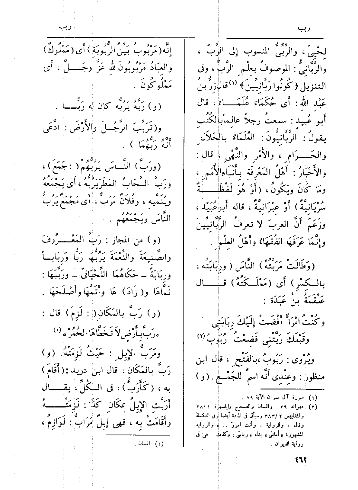 لِحْيِيّ، {- والرِّبِّيُّ الْمَنْسُوب إِلى الرَّبّ، والرَّبَّانِيُّ: الموصوفُ بعِلْمِ الرَّبِّ، وَفِي التَّنْزِيل: {كُونُواْ} رَبَّانِيّينَ} (آل عمرَان: 79) قَالَ زِرُّ بنُ عَبْدِ اللَّهِ: أَي حُكَمَاءَ عُلَمَاءَ، قَالَ أَبو عُبيدٍ: سمعتُ رجلا عالِماً بالكُتُبِ يقولُ: {الرَّبَّانِيُّونَ: العُلَمَاءُ بالحَلاَلِ والحَرَامِ، والأَمْرِ والنَّهْيِ، قَالَ: والأَخْبَارُ: أَهْلُ المَعْرِفَةِ بِأَنْبَاءِ الأُمَمِ، ومَا كَانَ ويَكُونُ، (أَوْ هُوَ لَفْظَةٌ سُرْيَانِيَّةٌ) أَوْ عِبْرَانِيَّةٌ، قَالَه أَبو عُبَيْد، وزَعَمَ أَنَّ العربَ لَا تعرفُ} الرَّبَّانِيِّينَ وإِنَّمَا عَرَفَهَا الفُقَهَاءُ وأَهْلُ العِلْمِ.