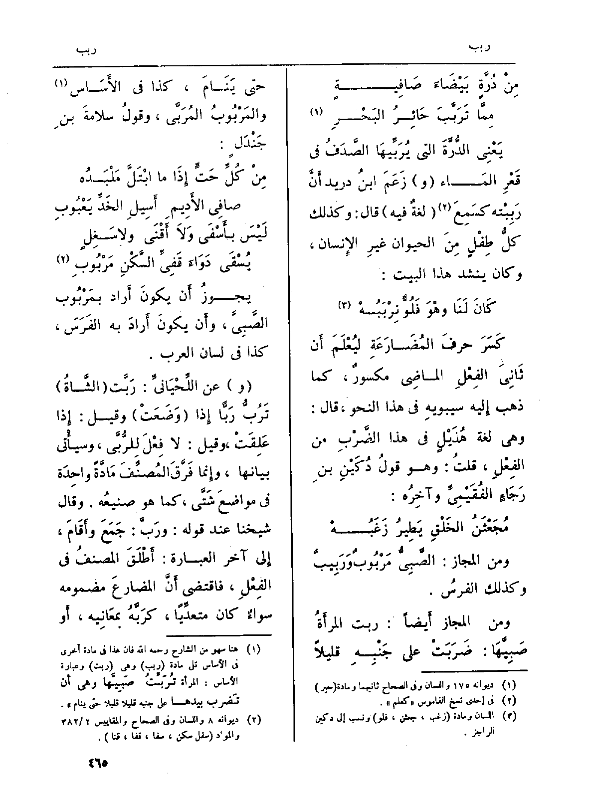 يَعْنِي الدُّرَّةَ الَّتِي يُرَبِّيهَا الصَّدَفُ فِي قَعْرِ المَاء (و) زَعَمَ ابنُ دُرَيْد أَنَّ رَبِبْته كسَمِعَ (لغةٌ فِيهِ) قَالَ: وَكَذَلِكَ كلُّ طِفْلٍ مِنَ الْحَيَوَان غيرِ الإِنسان، وَكَانَ ينشد هَذَا الْبَيْت: