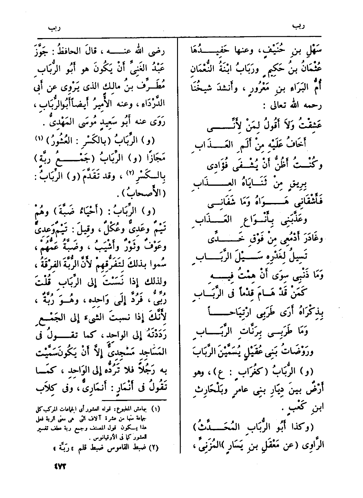 (و) الرِّبَابُ: (أَحْيَاءُ ضَبَّةَ) وهُمْ تَيْمٌ وعَدِيٌّ وعُكْلٌ، وقِيلَ: تَيْمٌ وَعِدِيٌّ وعَوْفٌ وثَوْرٌ وأَشْيَبُ، وضَبَّةُ عَمُّهُمْ، سُموا بذلكَ لِتَفَرُّقِهِمْ لأَنَّ الرُّبَّةَ الفِرْقَةُ، وَلذَلِك إِذا نَسَبْتَ إِلى الرِّبَابِ قُلْتَ رُبِّيُّ، فَرُدَّ إِلَى وَاحِدِه، وهُوَ رُبَّةٌ، لأَنَّكَ إِذا نسبتَ الشيءَ إِلى الجَمْعِ رَدَدْتَهُ إِلى الواحِدِ، كَمَا تقولُ فِي المَسَاجِدِ مَسْجِدِيٌّ إِلاَّ أَنْ يَكُونَ سَمَّيْت بِهِ رَجُلاً فَلَا تَرُدُّه إِلى الوَاحِدِ، كمَا تَقُولُ فِي أَنْمَارٍ: أَنمَارِيٌّ، وَفِي كِلاَب